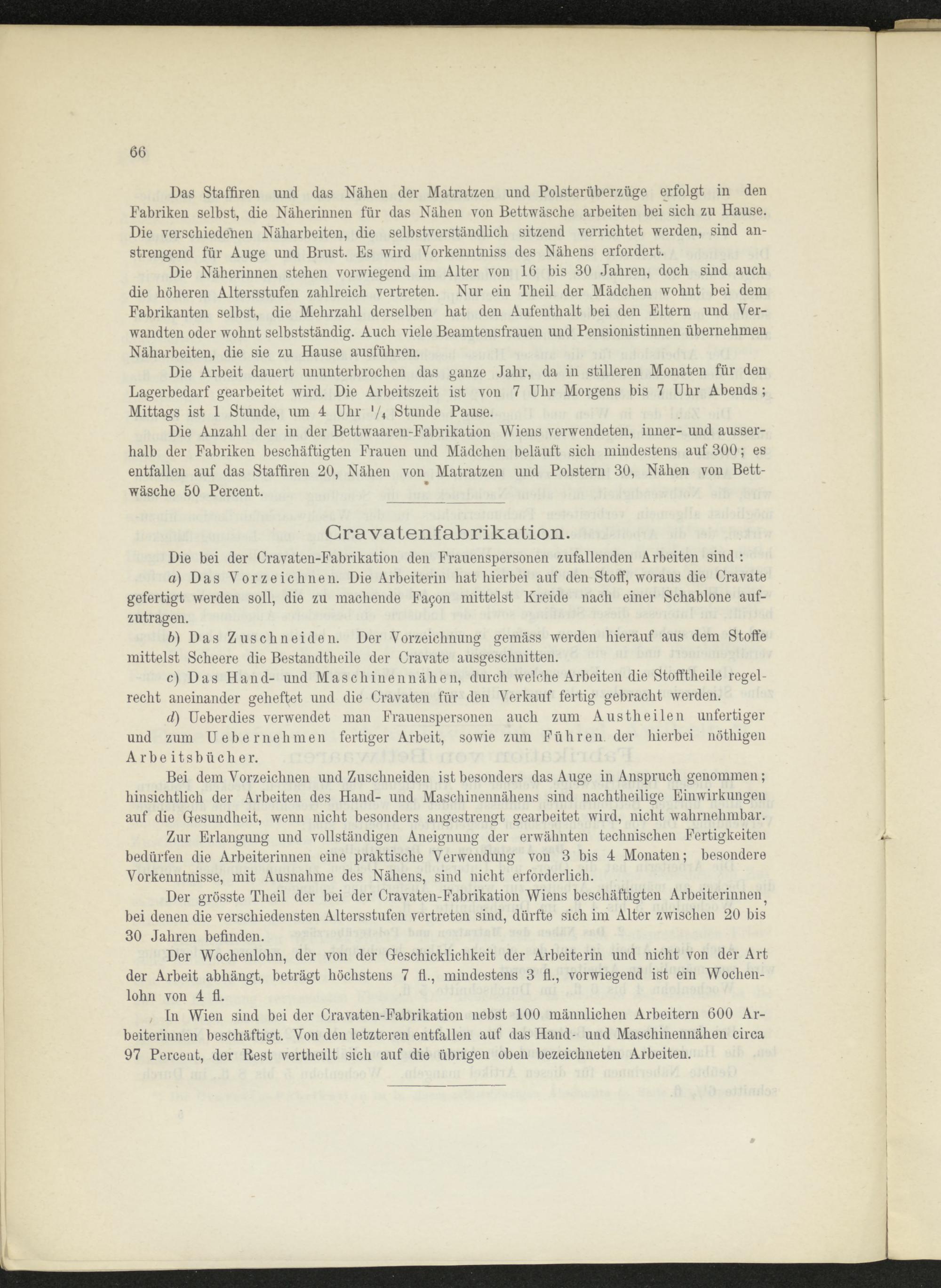 Die Anzahl der in der Bettwaaren-Fabrikation Wiens verwendeten, inner- und ausserhalb der Fabriken beschäftigten Frauen und Mädchen beläuft sich mindestens auf 300; es entfallen auf das Staffiren 20, Nähen von Matratzen und Polstern 30, Nähen von Bettwäsche 50 Percent.