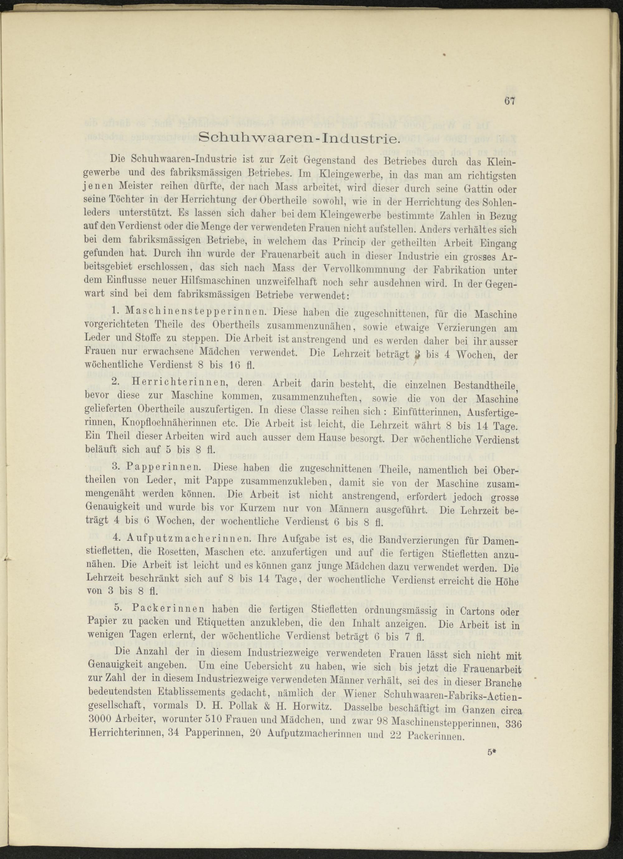 Die Anzahl der in diesem Industriezweige verwendeten Frauen lässt sich nicht mit Genauigkeit angeben. Um eine Uebersicht zu haben, wie sich bis jetzt die Frauenarbeit zur Zahl der in diesem Industriezweige verwendeten Männer verhält, sei des in dieser Branche bedeutendsten Etablissements gedacht, nämlich der Wiener Schuh waaren-Fabriks-Actien- gesellschaft, vormals D. H. Pollak & H. Horwitz. Dasselbe beschäftigt im Ganzen circa 3000 Arbeiter, worunter 510 Frauen und Mädchen, und zwar 98 Maschinenstepperinnen, 336 Herrichterinnen, 34 Papperinnen, 20 Aufputzmacherinnen und 22 Packenniien.