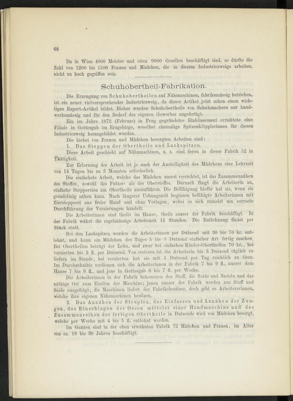 2. Das Annähen der Strupfen, das Einfassen und Annähen der Zungen, das Einschlagen der Oesen mittelst einer Handmaschine und das Zusammenreihen der fertigen Obertheile in Dutzende wird von Mädchen besorgt, welche per Woche mit 4 bis 5 fl. entlohnt werden.