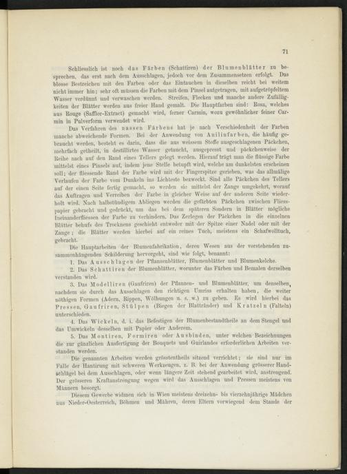 Schliesslich ist noch das Färben (Schattiren) der Blumenblätter zu besprechen, das erst nach dem Ausschlagen, jedoch vor dem Zusammensetzen erfolgt. Das blosse Bestreichen mit den Farben oder das Eintauchen in dieselben reicht bei weitem nicht immer hin; sehr oft müssen die Farben mit dem Pinsel aufgetragen, mit aufgetröpfeltem Wasser verdünnt und verwaschen werden. Streifen, Flecken und manche andere Zufälligkeiten der Blätter werden aus freier Hand gemalt. Die Hauptfarben sind: Rosa, welches aus Rouge (Safflor-Extract) gemacht wird, ferner Car min, wozu gewöhnlicher feiner Car- min in Pulverform verwendet wird.