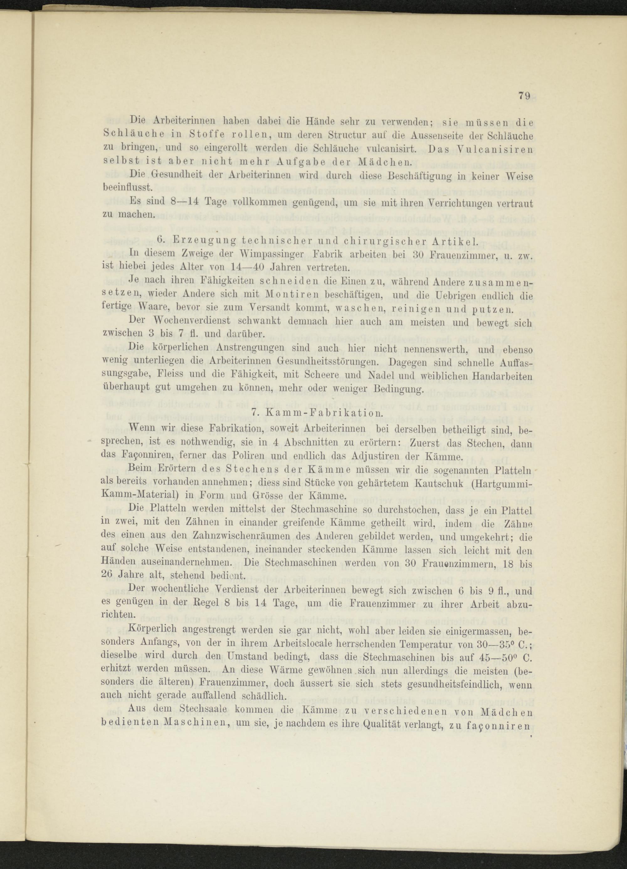 Körperlich angestrengt werden sie gar nicht, wohl aber leiden sie einigermassen, besonders Anfangs, von der in ihrem Arbeitslocale herrschenden Temperatur von 30—35° C.; dieselbe wird durch den Umstand bedingt, dass die Stechmaschinen bis auf 45—50° C. erhitzt werden müssen. An diese Wärme gewöhnen. sich nun allerdings die meisten (besonders die älteren) Frauenzimmer, doch äussert sie sich stets gesundheitsfeindlich, wenn auch nicht gerade auffallend schädlich.