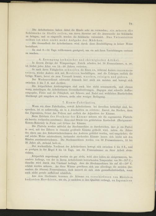 Wenn wir diese Fabrikation, soweit Arbeiterinnen bei derselben betheiligt sind, besprechen, ist es nothwendig, sie in 4 Abschnitten zu erörtern: Zuerst das Stechen, dann das Fa 9 onniren, ferner das Policen und endlich das Adjustiren der Kämme.