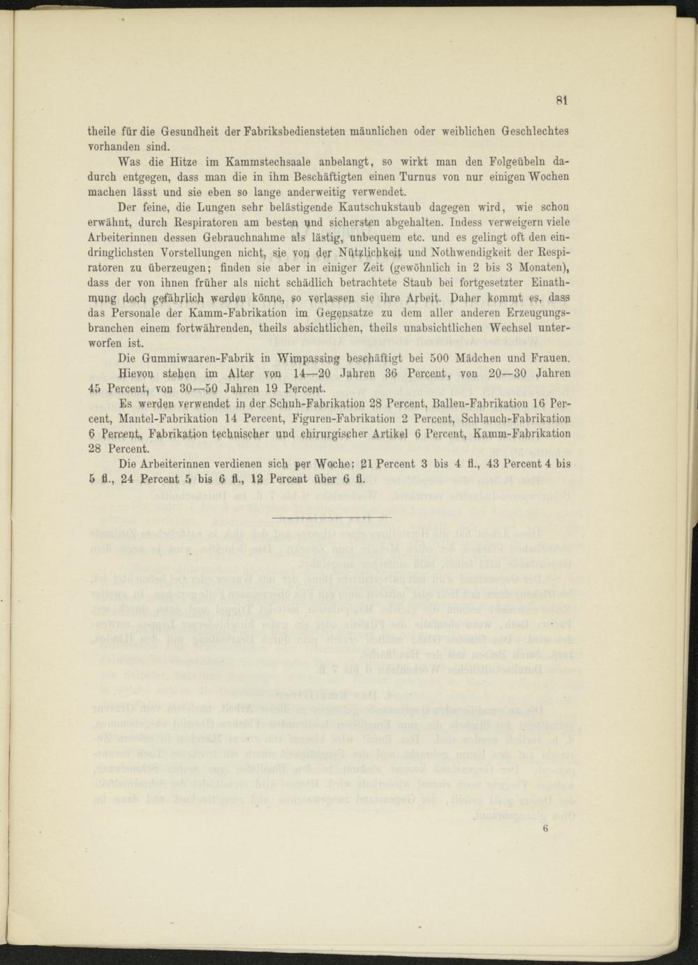 Die Arbeiterinnen verdienen sich per Woche; 21 Percent 3 bis 4 fl., 43 Percent 4 bis 5 fl., 24 Percent 5 bis 6 fl., 12 Percent über 6 fl.