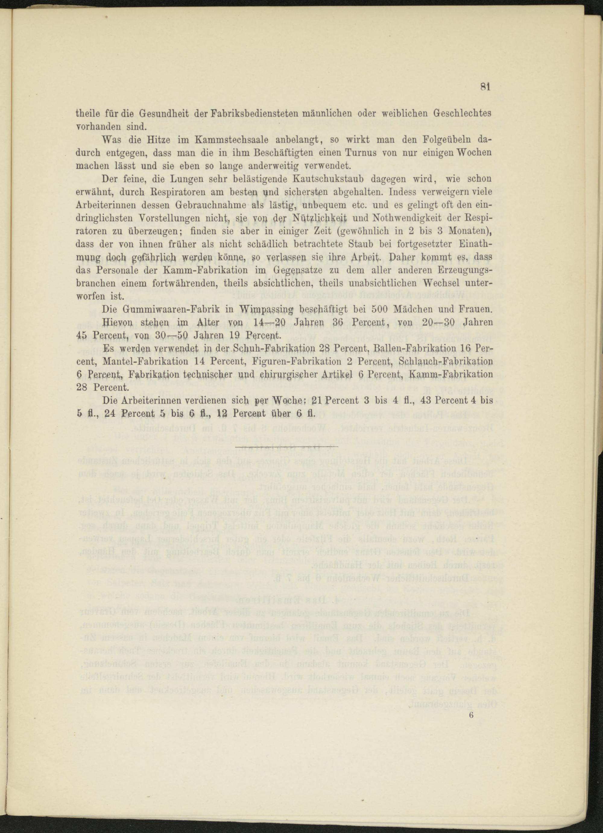 Der feine, die Lungen sehr belästigende Kautschukstaub dagegen wird, wie schon erwähnt, durch Respiratoren am besten und sichersten abgehalten. Indess verweigern viele Arbeiterinnen dessen Gebrauehnahme als lästig, unbequem etc. und es gelingt oft den eindringlichsten Vorstellungen nicht, sie von der Nützlichkeit und Nothwendigkeit der Respiratoren zu überzeugen; finden sie aber in einiger Zeit (gewöhnlich in 2 bis 3 Monaten), dass der von ihnen früher als nicht schädlich betrachtete Staub bei fortgesetzter Einath- mung doch gefährlich werden könne, so verlassen sie ihre Arbeit. Daher kommt es, dass das Personale der Kamm-Fabrikation im Gegensätze zu dem aller anderen Erzeugungsbranchen einem fortwährenden, theils absichtlichen, theils unabsichtlichen Wechsel unterworfen ist.