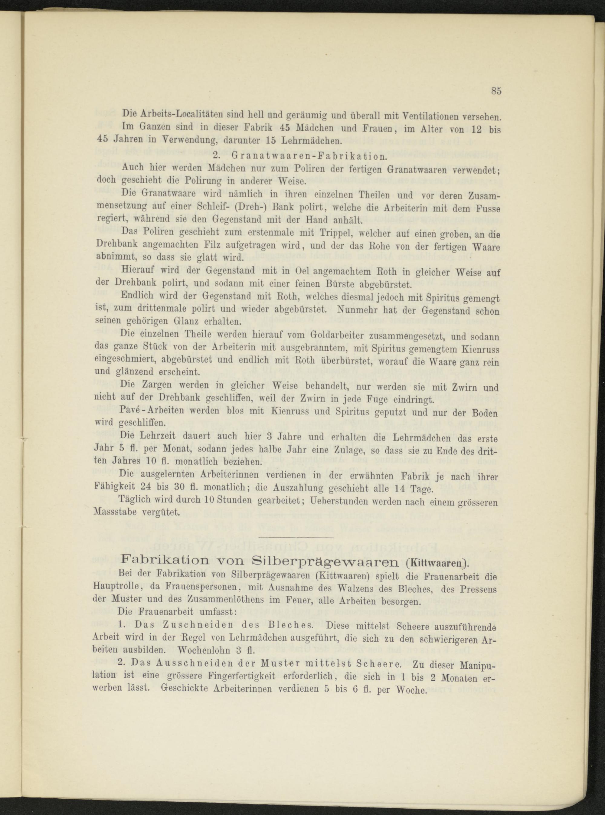 Bei der Fabrikation von Silberprägewaaren (Kittwaaren) spielt die Frauenarbeit die Hauptrolle, da Frauenspersonen, mit Ausnahme des Walzens des Bleches, des Pressens der Muster und des Zusammenlöthens im Feuer, alle Arbeiten besorgen.