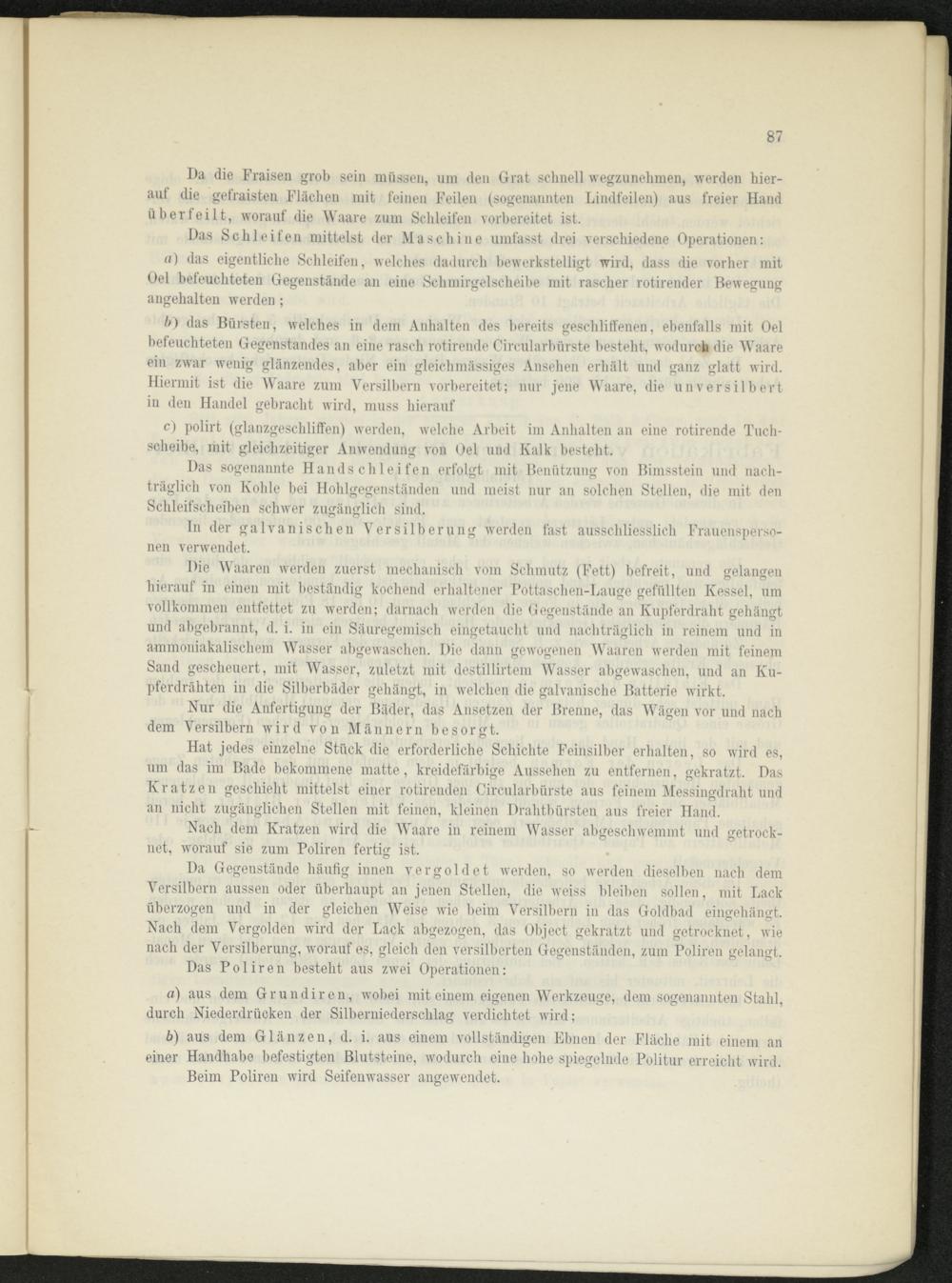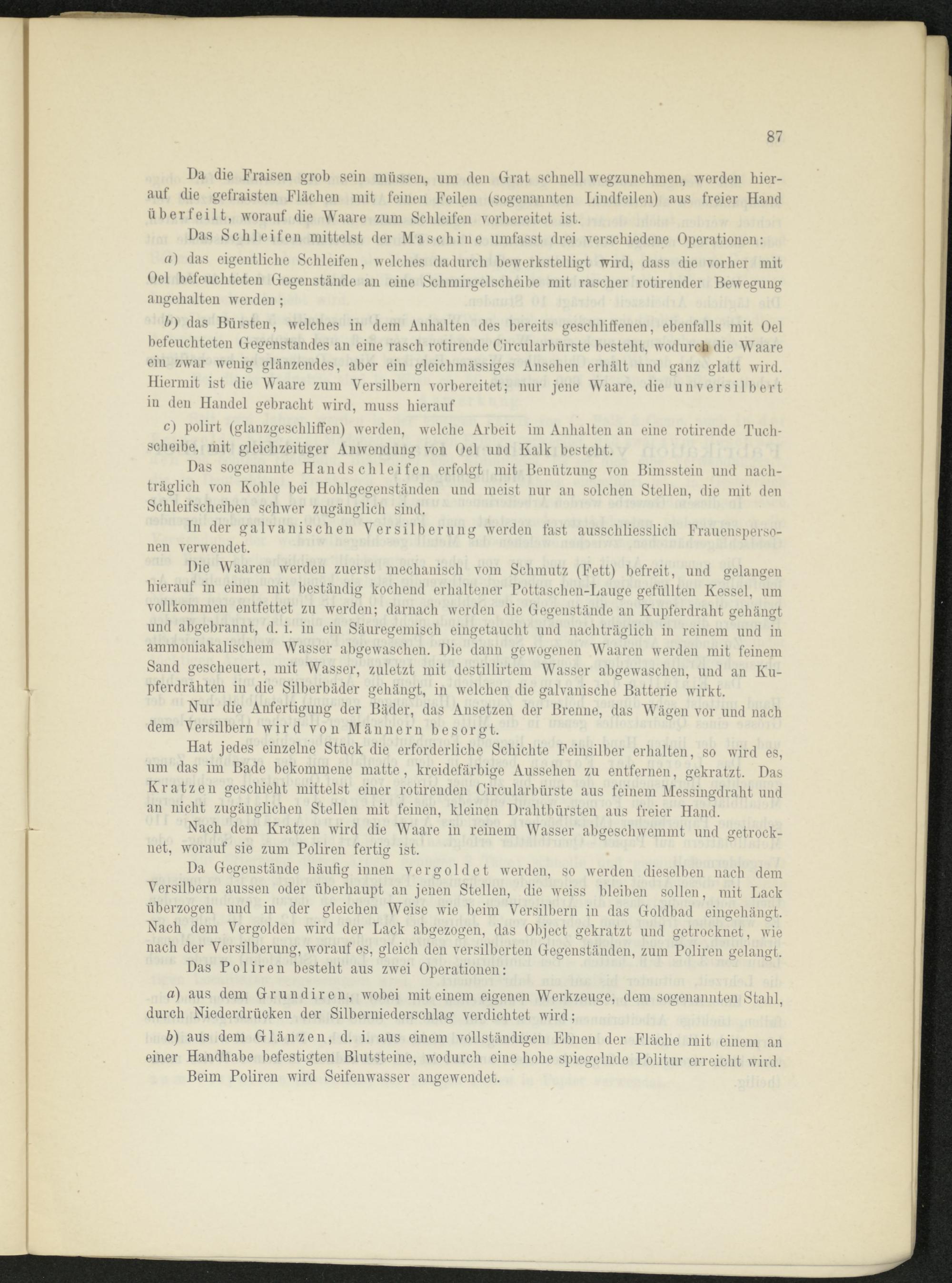 b) das Bürsten, welches in dem Anhalten des bereits geschliffenen, ebenfalls mit Oel befeuchteten Gegenstandes an eine rasch rotirende Circularbürste besteht, Avodurch die Waare ein zwar wenig glänzendes, aber ein gleichmässiges Ansehen erhält und ganz glatt wird. Hiermit ist die Waare zum Versilbern vorbereitet; nur jene Waare, die unversilbert in den Handel gebracht wird, muss hierauf
