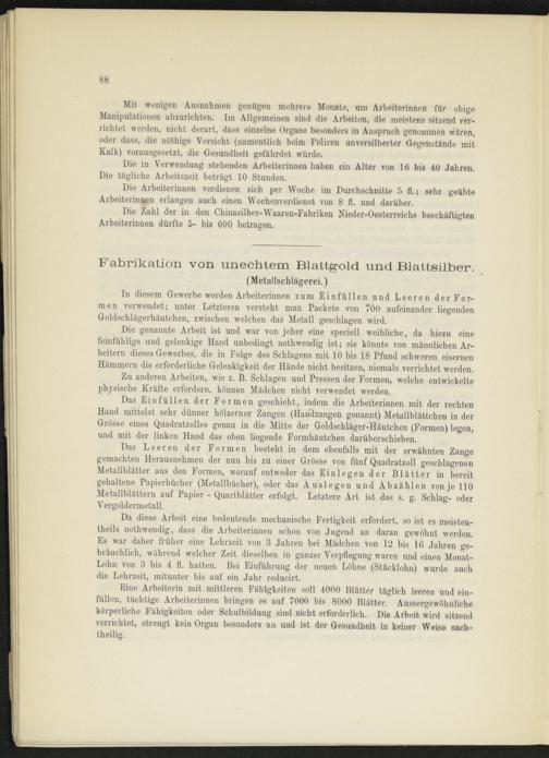 In diesem Gewerbe werden Arbeiterinnen zum Einfüllen und Leeren der Formen verwendet; unter Letzteren versteht man Packete von 700 aufeinander liegenden Goldschlägerhäutchen, zwischen welchen das Metall geschlagen wird.