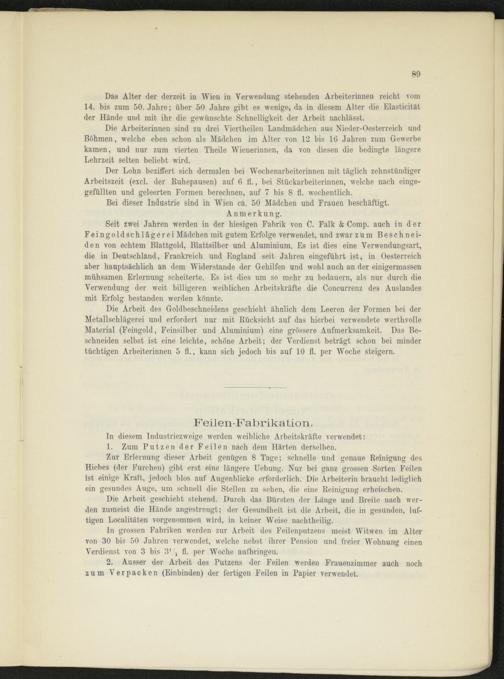 Seit zwei Jahren werden in der hiesigen Fabrik von C. Falk & Comp, auch in der Feingoldschlägerei Mädchen mit gutem Erfolge verwendet, und zwar zum Beschneiden von echtem Blattgold, Blattsilber und Aluminium. Es ist dies eine Verwendungsart, die in Deutschland, Frankreich und England seit Jahren eingeführt ist, in Oesterreich aber hauptsächlich an dem Widerstande der Gehilfen und wohl auch an der einigermassen mühsamen Erlernung scheiterte. Es ist dies um so mehr zu bedauern, als nur durch die Verwendung der weit billigeren weiblichen Arbeitskräfte die Concurrenz des Auslandes mit Erfolg bestanden werden könnte.