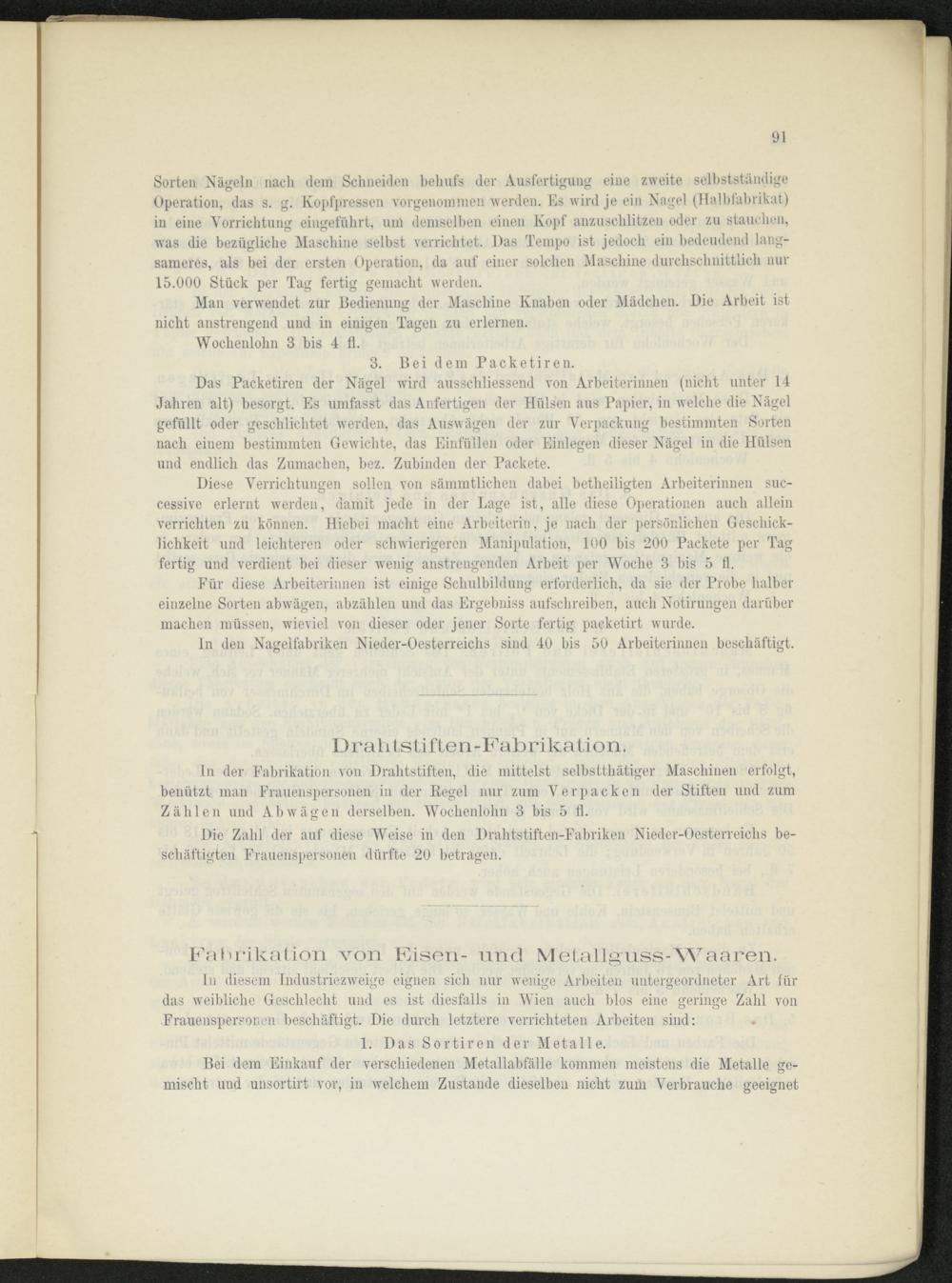 ln der Fabrikation von Drahtstiften, die mittelst selbstthätiger Maschinen erfolgt, benützt man Frauenspersonen in der Kegel nur zum Verpacken der Stiften und zum Zählen und Ab wägen derselben. Wochenlohn 3 bis 5 fl.