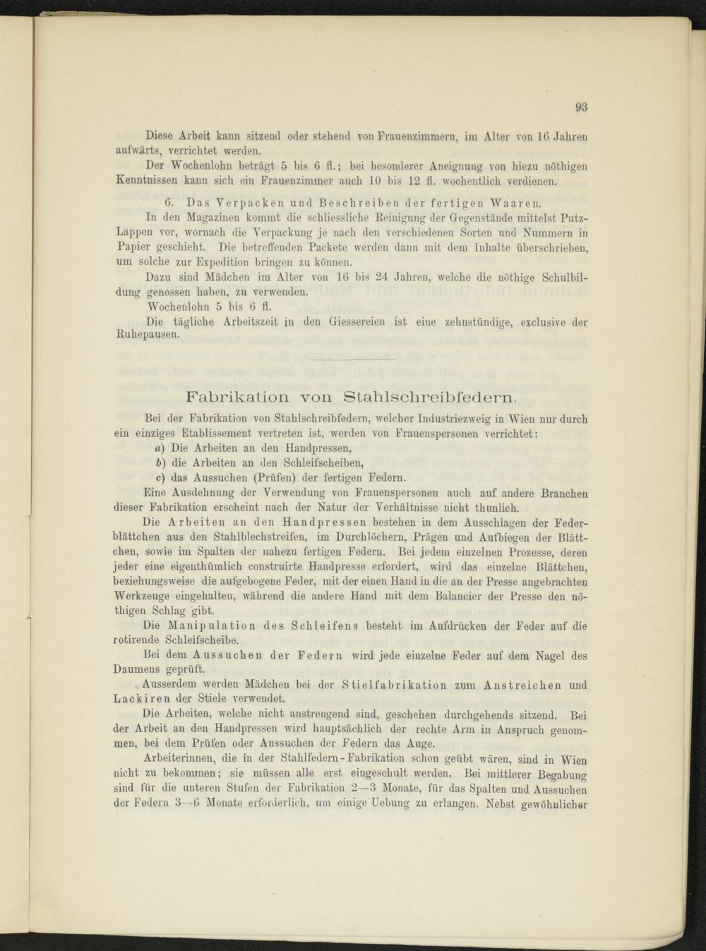 Bei der Fabrikation von Stahlschreibfedern, welcher Industriezweig in Wien nur durch ein einziges Etablissement vertreten ist, werden von Frauenspersonen verrichtet: