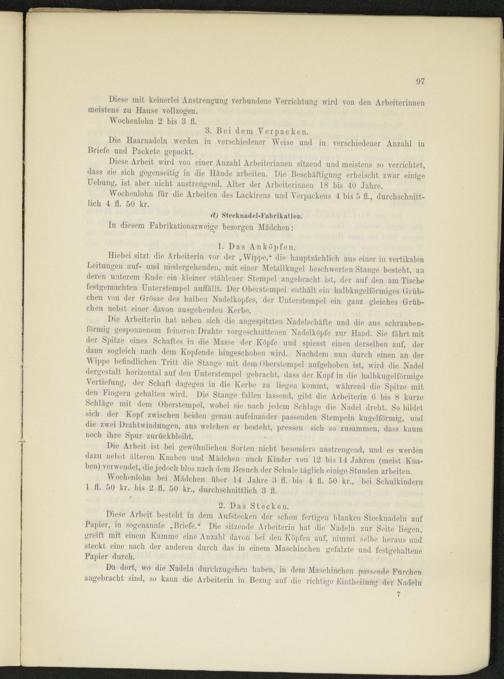 Diese Arbeit wird von einer Anzahl Arbeiterinnen sitzend und meistens so verrichtet, dass sie sich gegenseitig in die Hände arbeiten. Die Beschäftigung erheischt zwar einige Uebung, ist aber nicht anstrengend. Alter der Arbeiterinnen 18 bis 40 Jahre.