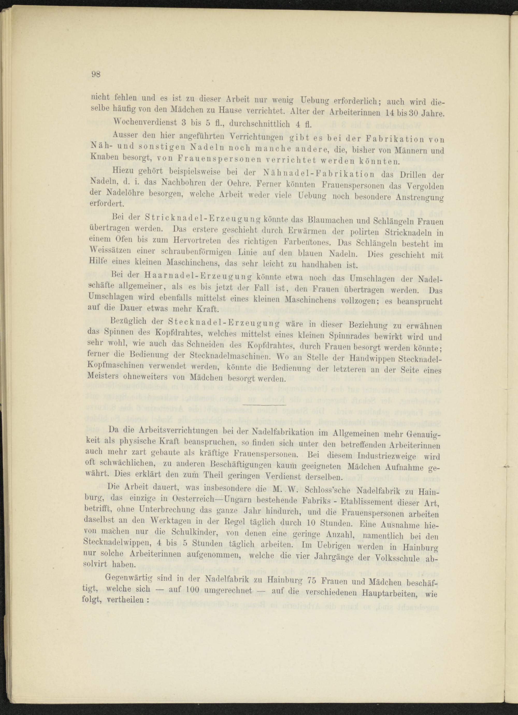Die Arbeit dauert, was insbesondere die M. W. Schloss’sche Nadelfabrik zu Hainburg, das einzige in Oesterreich—Ungarn bestehende Fabriks - Etablissement dieser Art, betrifft, ohne Unterbrechung das ganze Jahr hindurch, und die Frauenspersonen arbeiten daselbst an den Werktagen in der Regel täglich durch 10 Stunden. Eine Ausnahme hievon machen nur die Schulkinder, von denen eine geringe Anzahl, namentlich bei den Stecknadelwippen, 4 bis 5 Stunden täglich arbeiten. Im Uebrigen werden in Hainburg nur solche Arbeiterinnen aufgenommen, welche die vier Jahrgänge der Volksschule ab- solvirt haben.