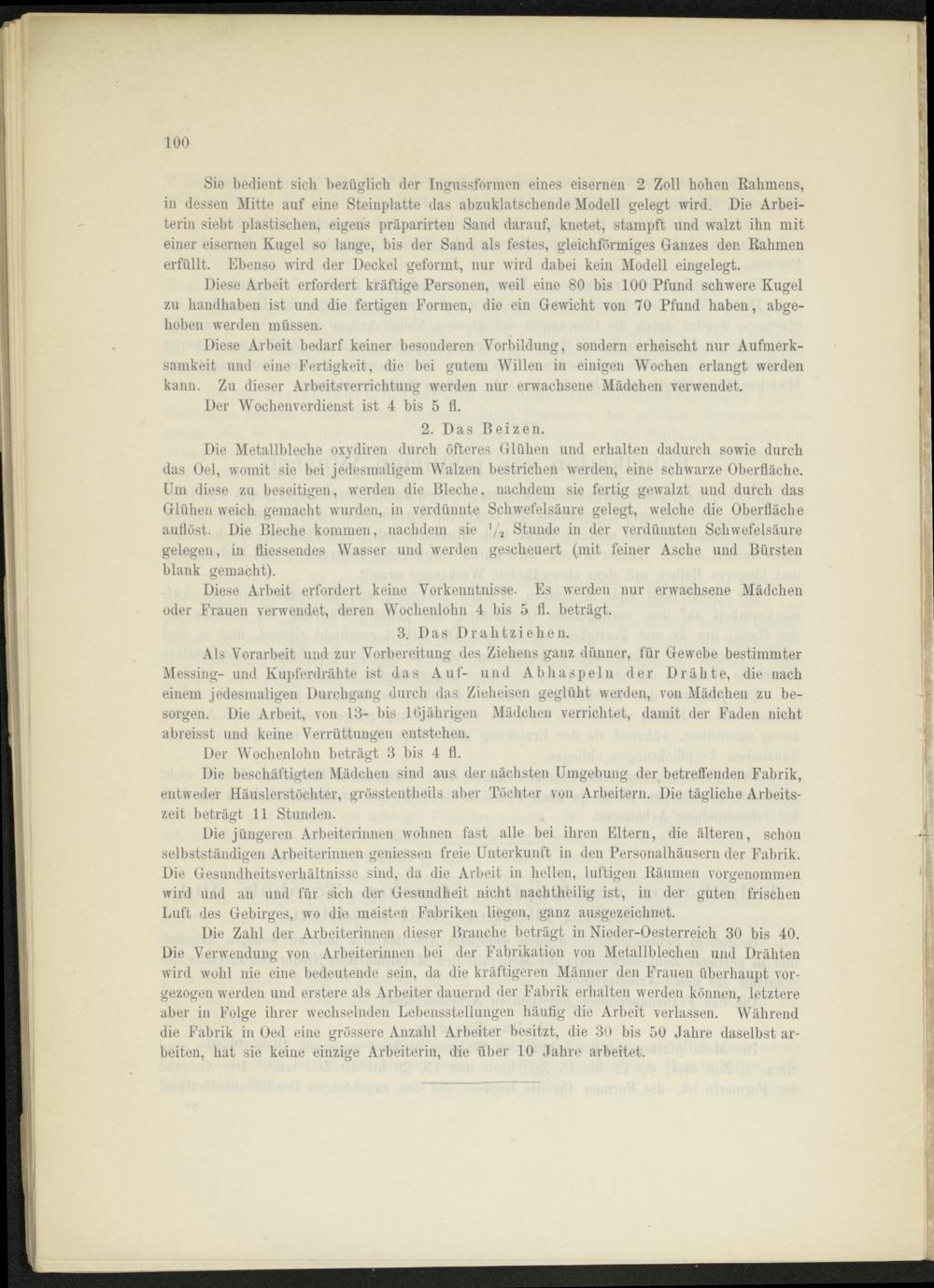 Die Zahl der Arbeiterinnen dieser Branche beträgt in Nieder-Oesterreich 30 bis 40. Die Verwendung von Arbeiterinnen bei der Fabrikation von Metallblechen und Drähten wird wohl nie eine bedeutende sein, da die kräftigeren Männer den Frauen überhaupt vorgezogen werden und erstere als Arbeiter dauernd der Fabrik erhalten werden können, letztere aber in Folge ihrer wechselnden Lebensstellungen häufig die Arbeit verlassen. Während die Fabrik in Oed eine grössere Anzahl Arbeiter besitzt, die 30 bis 50 Jahre daselbst arbeiten, hat sie keine einzige Arbeiterin, die über 10 Jahre arbeitet.