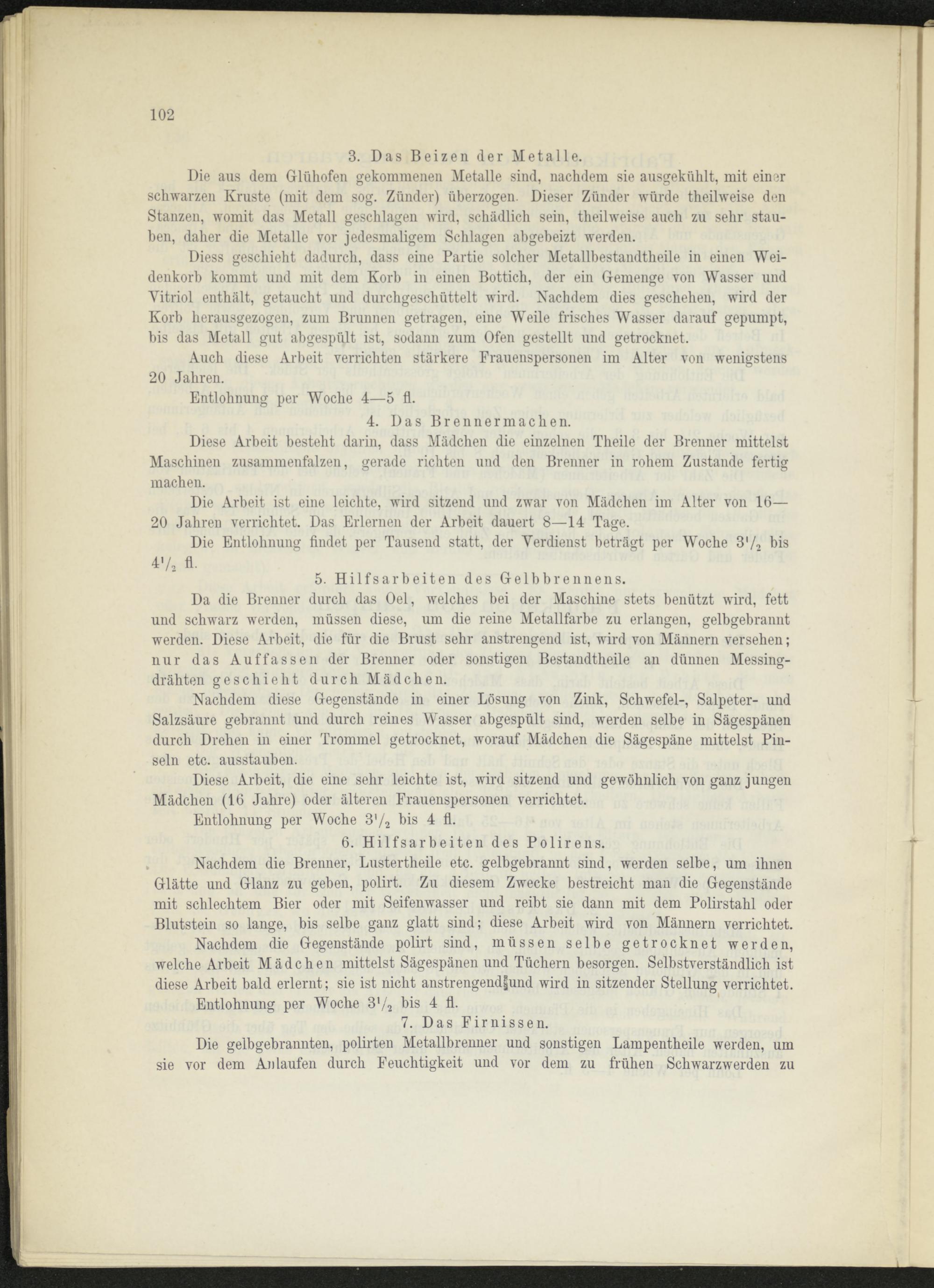 Da die Brenner durch das Oel, welches bei der Maschine stets benützt wird, fett und schwarz werden, müssen diese, um die reine Metallfarbe zu erlangen, gelbgebrannt werden. Diese Arbeit, die für die Brust sehr anstrengend ist, wird von Männern versehen; nur das Auffassen der Brenner oder sonstigen Bestandtheile an dünnen Messingdrähten geschieht durch Mädchen.