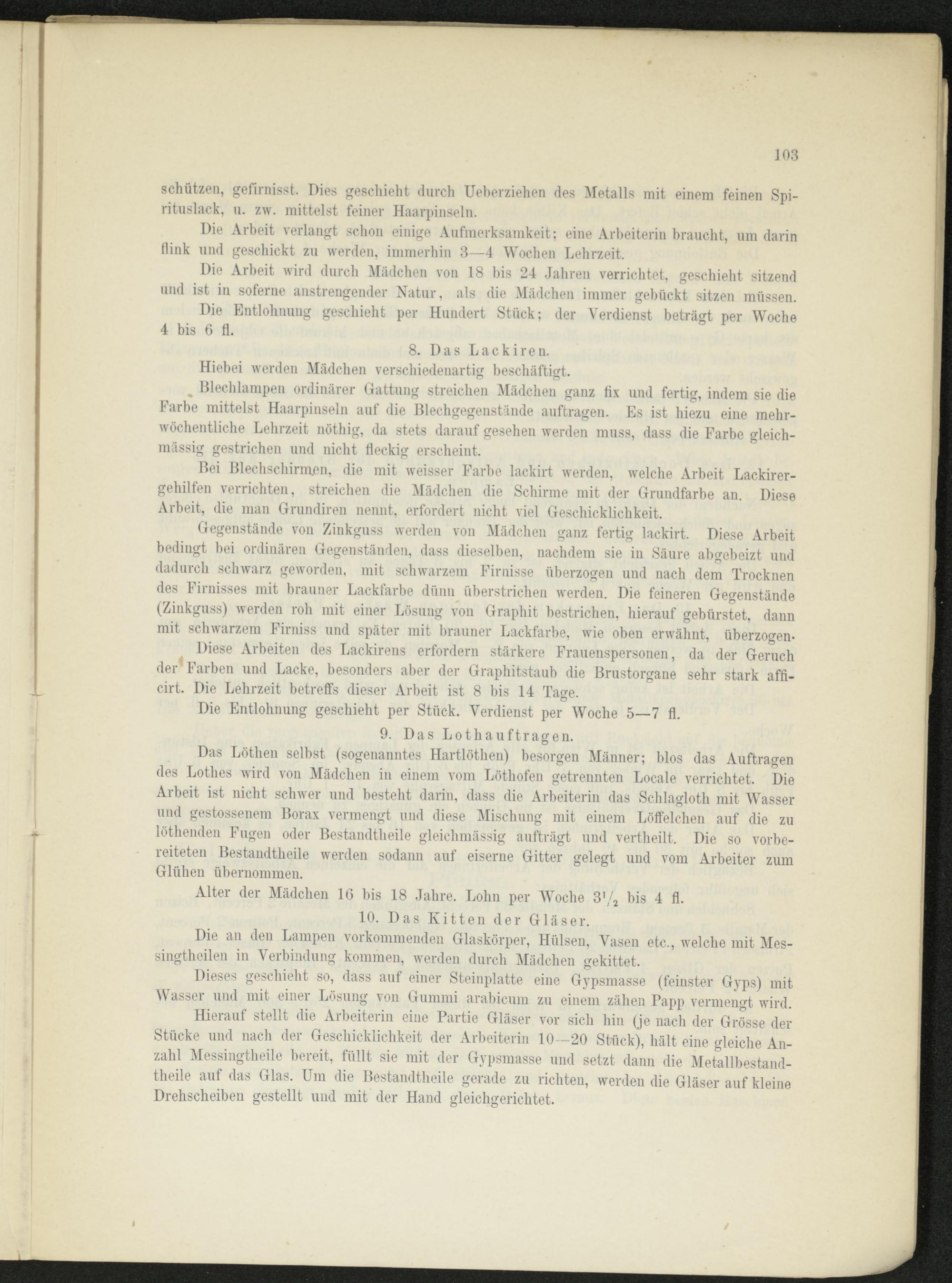 Die Entlohnung geschieht per Hundert Stück; der Verdienst beträgt per Woche 4 bis 6 fl.