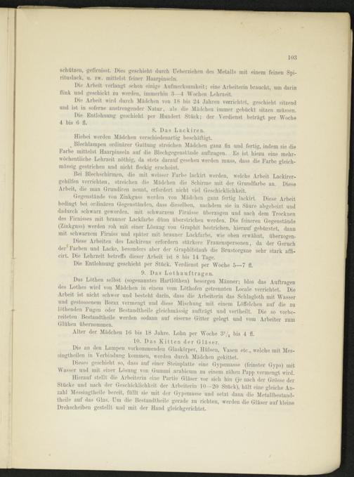 Bleehlampen ordinärer Gattung streichen Mädchen ganz fix und fertig, indem sie die Farbe mittelst Haarpinseln auf die Blechgegenstände auffcragen. Es ist hiezu eine mehrwöchentliche Lehrzeit nötliig, da stets darauf gesehen werden muss, dass die Farbe gleich- mässig gestrichen und nicht fleckig erscheint.