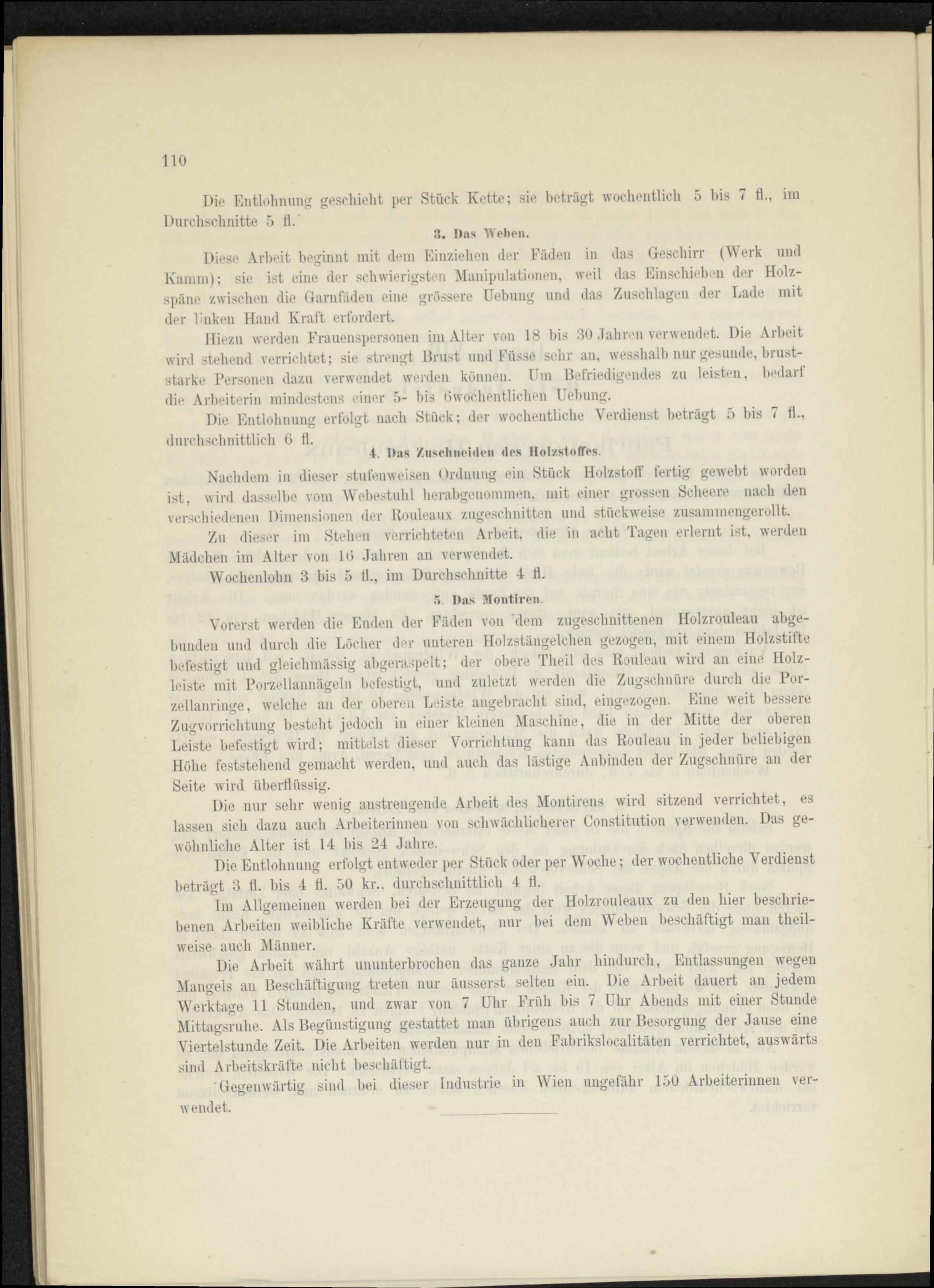 Die Entlohnung erfolgt entweder per Stück oder per Woche; der wöchentliche Verdienst beträgt 3 fl. bis 4 fl. 50 kr., durchschnittlich 4 fl.