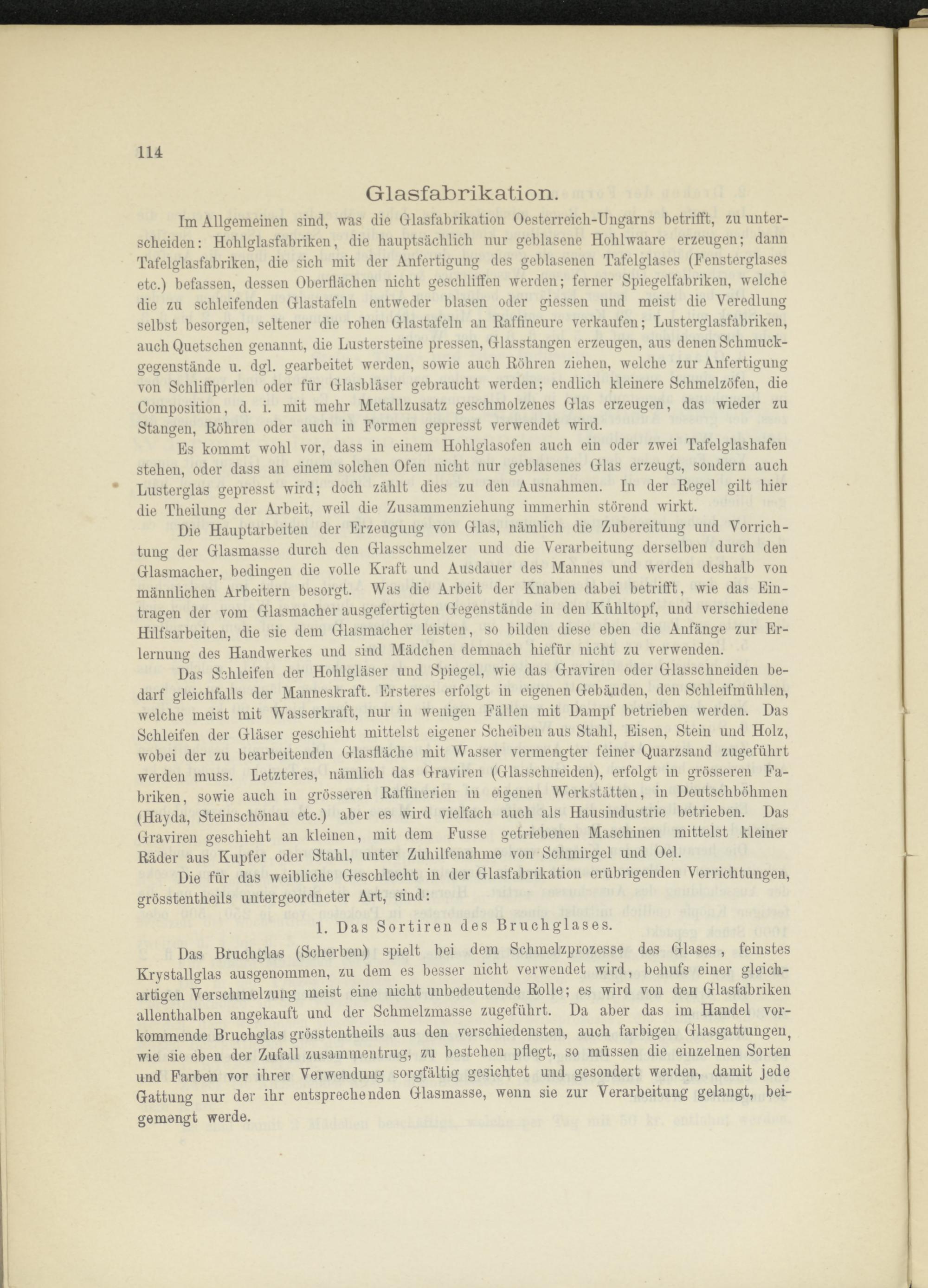Im Allgemeinen sind, was die Glasfabrikation Oesterreich-Ungarns betrifft, zu unterscheiden: Hohlglasfabriken, die hauptsächlich nur geblasene Hohhvaare erzeugen; dann Tafelglasfabriken, die sich mit der Anfertigung des geblasenen Tafelglases (Fensterglases etc.) befassen, dessen Oberflächen nicht geschliffen werden; ferner Spiegelfabriken, welche die zu schleifenden Glastafeln entweder blasen oder giessen und meist die Veredlung selbst besorgen, seltener die rohen Glastafeln an Raffineure verkaufen; Lusterglasfabriken, auch Quetschen genannt, die Lustersteine pressen, Glasstangen erzeugen, aus denen Schmuckgegenstände u. dgl. gearbeitet werden, sowie auch Röhren ziehen, welche zur Anfertigung von Schliffperlen oder für Glasbläser gebraucht werden; endlich kleinere Schmelzöfen, die Composition, d. i. mit mehr Metallzusatz geschmolzenes Glas erzeugen, das wieder zu Stangen, Röhren oder auch in Formen gepresst verwendet wird.