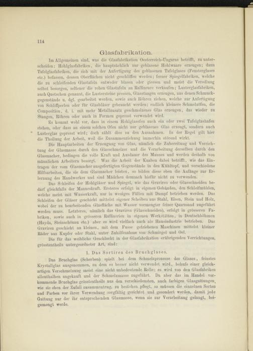 Die Hauptarbeiten der Erzeugung von Glas, nämlich die Zubereitung und Vorrichtung der Glasmasse durch den Glasschmelzer und die Verarbeitung derselben durch den Glasmacher, bedingen die volle Kraft und Ausdauer des Mannes und werden deshalb von männlichen Arbeitern besorgt. Was die Arbeit der Knaben dabei betrifft, wie das Einträgen der vom Glasmacher ausgefertigten Gegenstände in den Kühltopf, und verschiedene Hilfsarbeiten, die sie dem Glasmacher leisten, so bilden diese eben die Anfänge zur Er- lernuno- des Handwerkes und sind Mädchen demnach hiefür nicht zu verwenden.