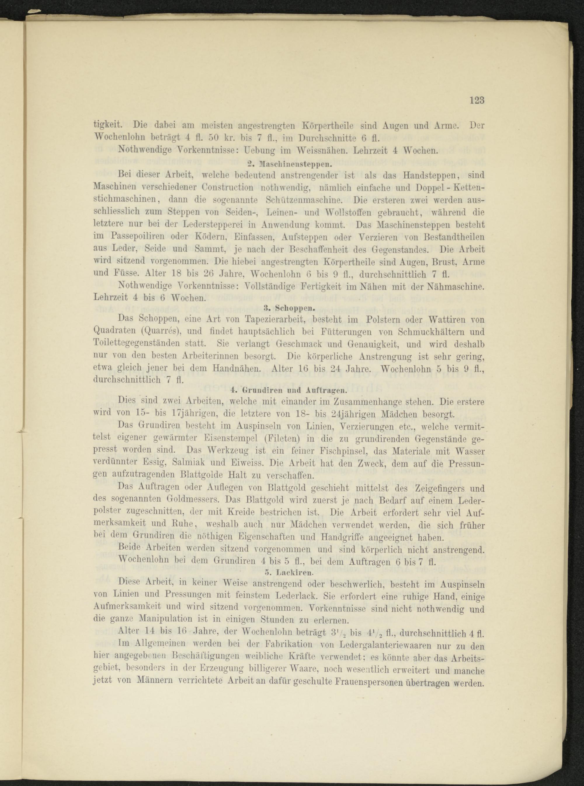 tigkeit. Die dabei am meisten angestrengten Körpertlieile sind Angen und Arme. Der Wochenlohn beträgt 4 fl. 50 kr. bis 7 fl., im Durchschnitte 6 fl.