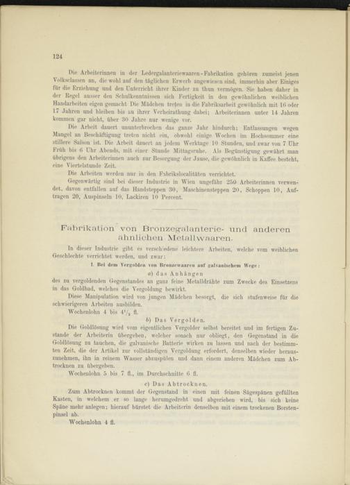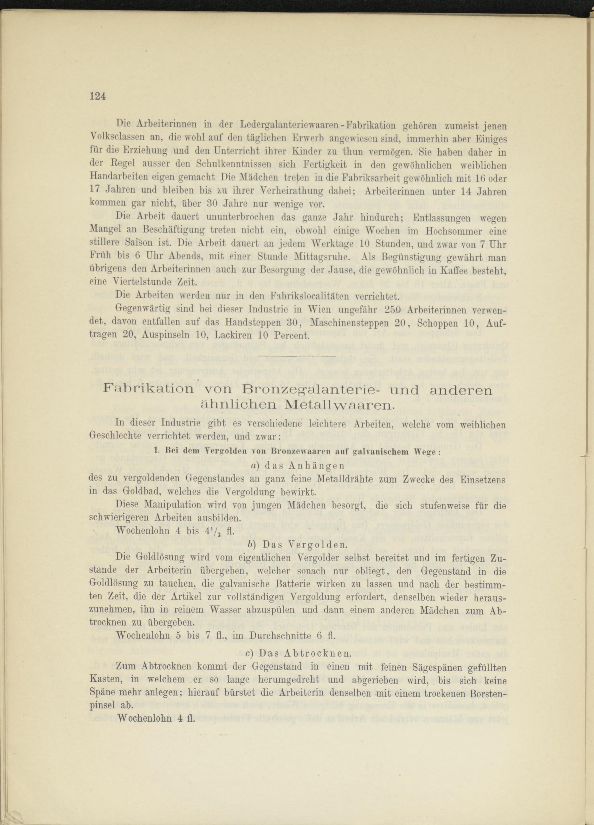 Die Arbeiterinnen in der Ledergalanteriewaaren - Fabrikation gehören zumeist jenen Volksclassen an, die wohl auf den täglichen Erwerb angewiesen sind, immerhin aber Einiges für die Erziehung und den Unterricht ihrer Kinder zu tlnin vermögen. Sie haben daher in der Kegel ausser den Schulkenntnissen sich Fertigkeit in den gewöhnlichen weiblichen Handarbeiten eigen gemacht Die Mädchen treten in die Fabriksarbeit gewöhnlich mit 16 oder 17 Jahren und bleiben bis zu ihrer Verheirathung dabei; Arbeiterinnen unter 14 Jahren kommen gar nicht, über 30 Jahre nur wenige vor.