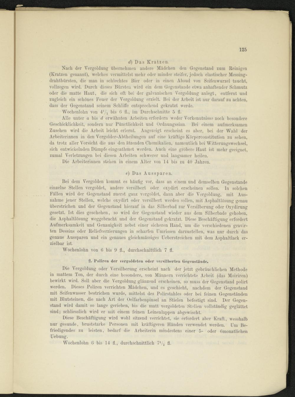 Alle unter a bis d erwähnten Arbeiten erfordern weder Vorkenntnisse noch besondere Geschicklichkeit, sondern nur Pünctlichkeit und Ordnungssinn. Bei einem aufmerksamen Zusehen wird die Arbeit leicht erlernt. Angezeigt erscheint es aber, bei der Wahl der Arbeiterinnen in den Vergolder-Abtheilungen auf eine kräftige Körperconstitution zu sehen, da trotz aller Vorsicht die aus den ätzenden Chemikalien, namentlich bei Witterungswechsel, sich entwickelnden Dämpfe eingeatlnnet werden. Audi eine gröbere Haut ist mehr geeignet, zumal Verletzungen bei diesen Arbeiten schwerer und langsamer heilen.
