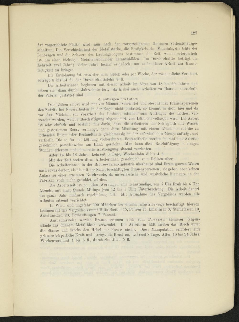 In Wien sind ungefähr 200 Mädchen bei diesem Industriezweige beschäftigt, hiervon kommen auf das Vergolden sammt Hilfsarbeiten 45, Poliren 15, Emailliren 3, Steinefassen 10 Ausschneiden 20, Lothauftragen 7 Percent.