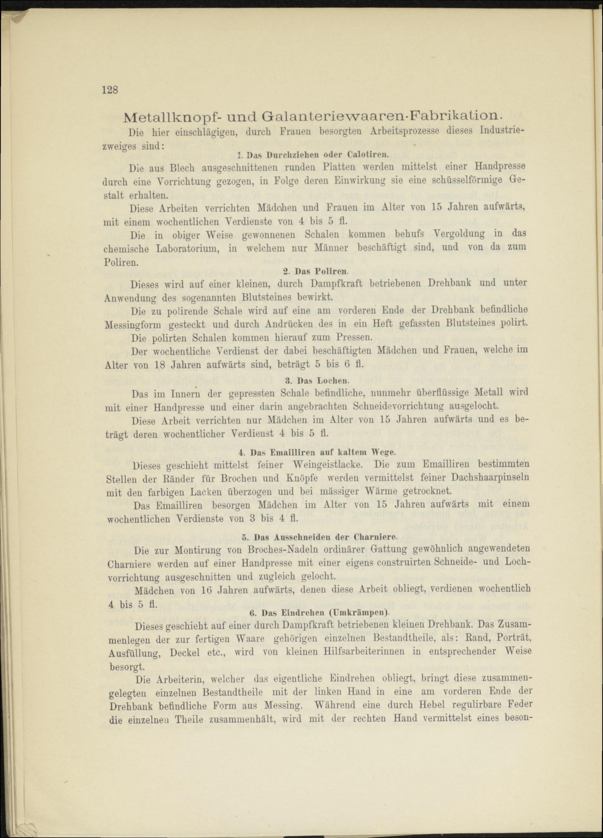 Das Emailliren besorgen Mädchen im Alter von 15 Jahren aufwärts mit einem wöchentlichen Verdienste von 3 bis 4 fl.