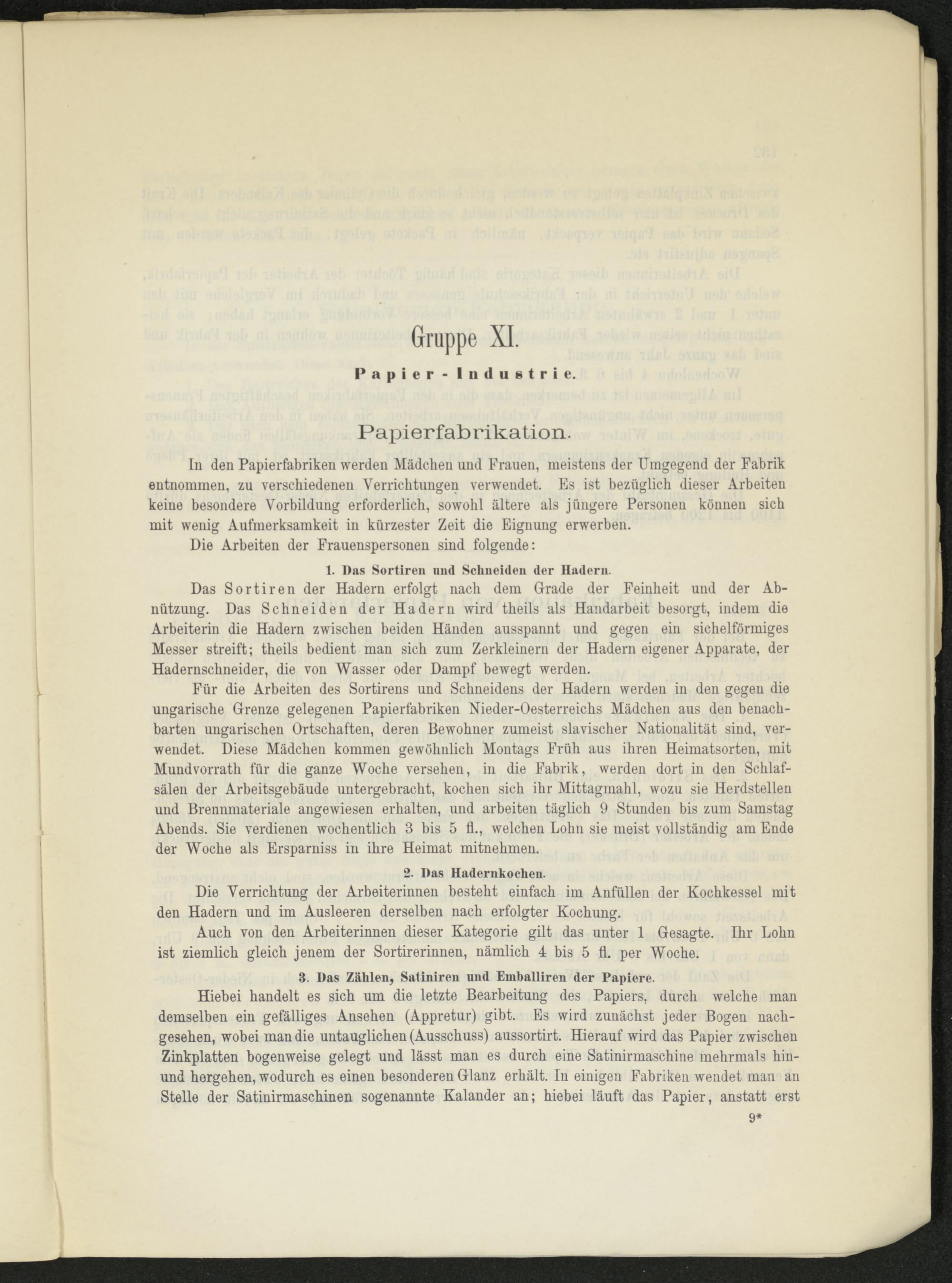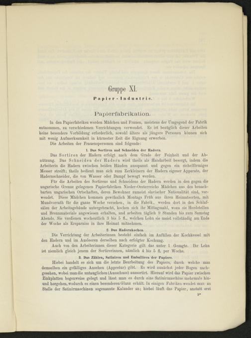 Für die Arbeiten des Sortirens und Schneidens der Hadern werden in den gegen die ungarische Grenze gelegenen Papierfabriken Nieder-Oesterreichs Mädchen aus den benachbarten ungarischen Ortschaften, deren Bewohner zumeist slavischer Nationalität sind, verwendet. Diese Mädchen kommen gewöhnlich Montags Früh aus ihren Heimatsorten, mit Mundvorrath für die ganze Woche versehen, in die Fabrik, werden dort in den Schlafsälen der Arbeitsgebäude untergebracht, kochen sich ihr Mittagmahl, wozu sie Herdstellen und Brennmateriale angewiesen erhalten, und arbeiten täglich 9 Stunden bis zum Samstag Abends. Sie verdienen wöchentlich 3 bis 5 fl., welchen Lohn sie meist vollständig am Ende der Woche als Ersparniss in ihre Heimat mitnehmen.