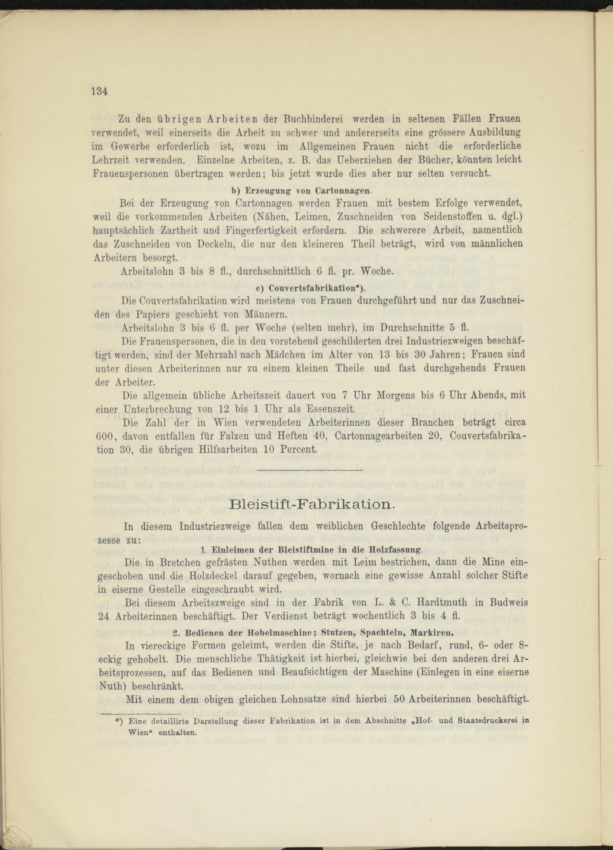 Bei diesem Arbeitszweige sind in der Fabrik von L. & C. Hardtmuth in Budweis 24 Arbeiterinnen beschäftigt. Der Verdienst beträgt wöchentlich 3 bis 4 fl.