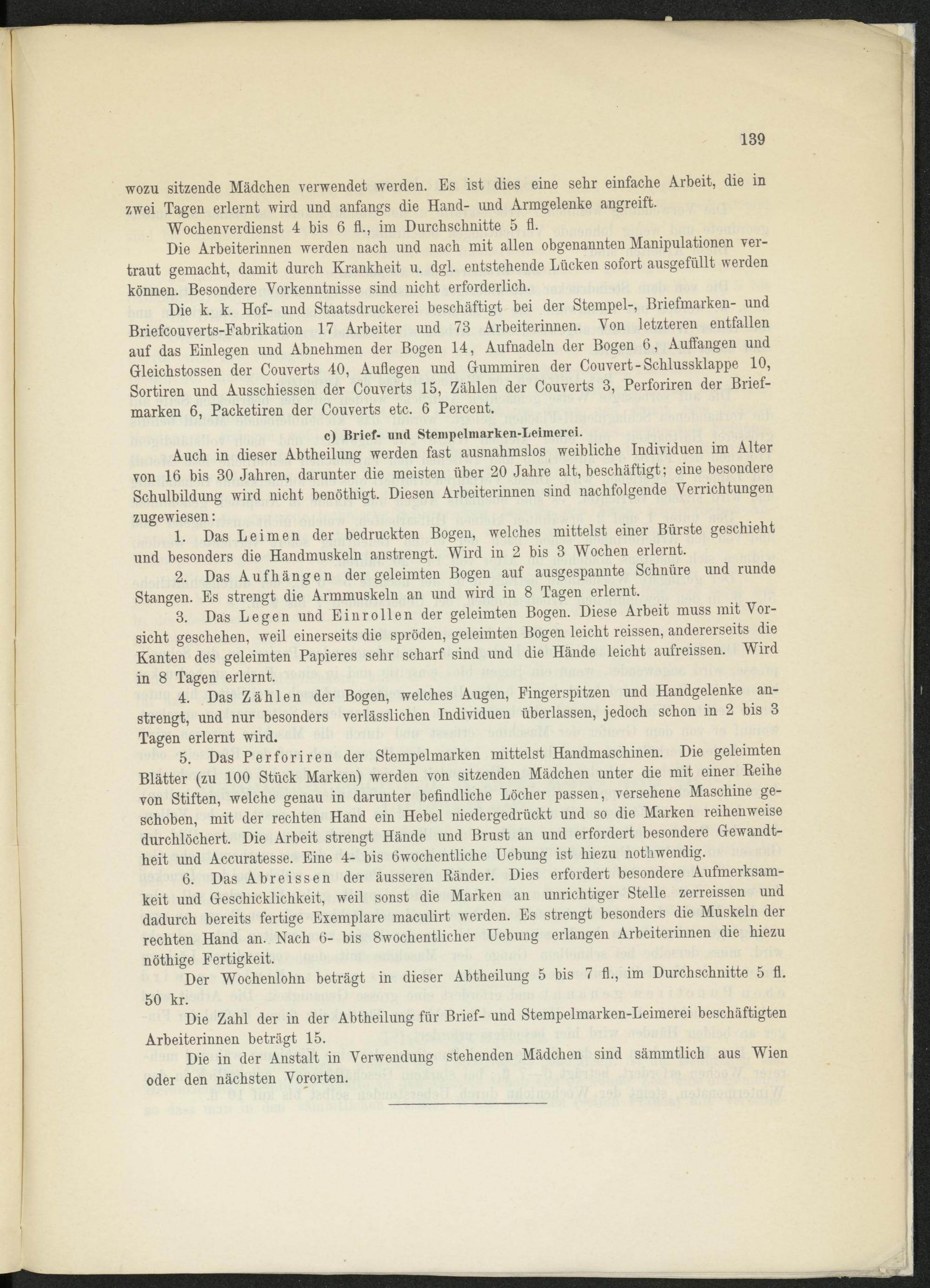 Auch in dieser Abtheilung werden fast ausnahmslos weibliche Individuen im Alter von 16 bis 30 Jahren, darunter die meisten über 20 Jahre alt, beschäftigt; eine besondere Schulbildung wird nicht benöthigt. Diesen Arbeiterinnen sind nachfolgende Yerrichtungen zugewiesen: