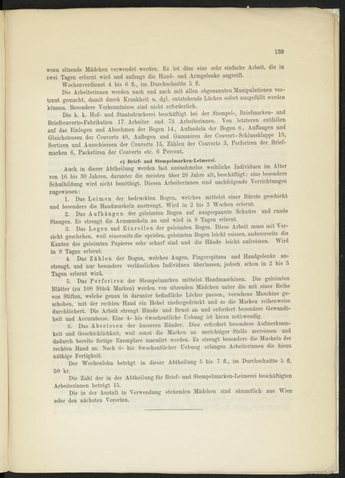 Die Zahl der in der Abtheilung für Brief- und Stempelmarken-Leimerei beschäftigten Arbeiterinnen beträgt 15.
