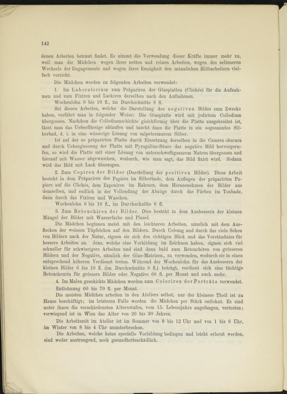 Die Mädchen beginnen meist mit den leichteren Arbeiten, nämlich mit dem Ausflecken der weissen Tüpfelchen auf den Bildern. Durch Uebung und durch das viele Sehen von Bildern nach der Natur, eignen sie sich den richtigen Blick und das Verständniss für bessere Arbeiten an. Jene, welche eine Vorbildung im Zeichnen haben, eignen sich viel schneller für schwierigere Arbeiten und sind dann bald zum Retouchiren von grösseren Bildern und der Negative, nämlich der Glas-Matrizen, zu verwenden, wodurch sie in einen entsprechend höheren Verdienst treten. Während der Wochenlohn für das Ausbessern der kleinen Bilder 6 bis 10 fl. (im Durchschnitte 8 fl.) beträgt, verdient sich eine tüchtige Retoucheurin für grössere Bilder oder Negative 60 fl. per Monat und auch mehr.