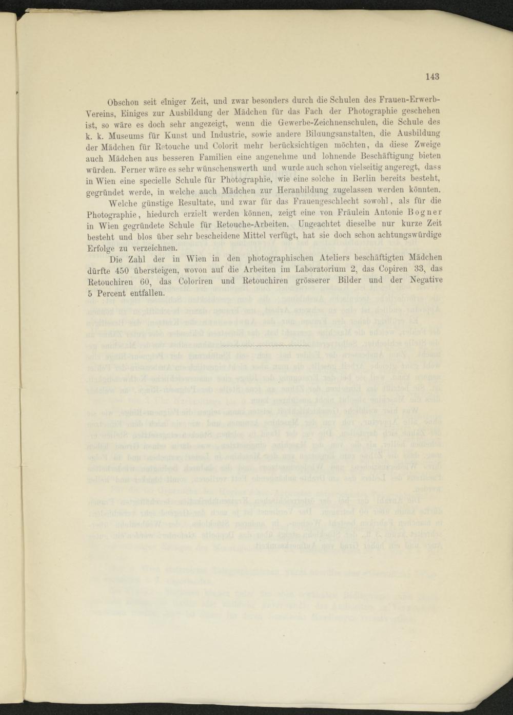 Welche günstige Resultate, und zwar für das Frauengeschlecht sowohl, als für die Photographie, hiedurch erzielt werden können, zeigt eine von Fräulein Antonie Bogner in Wien gegründete Schule für Retouche-Arbeiten. Ungeachtet dieselbe nur kurze Zeit besteht und blos über sehr bescheidene Mittel verfügt, hat sie doch schon achtungswürdige Erfolge zu verzeichnen.