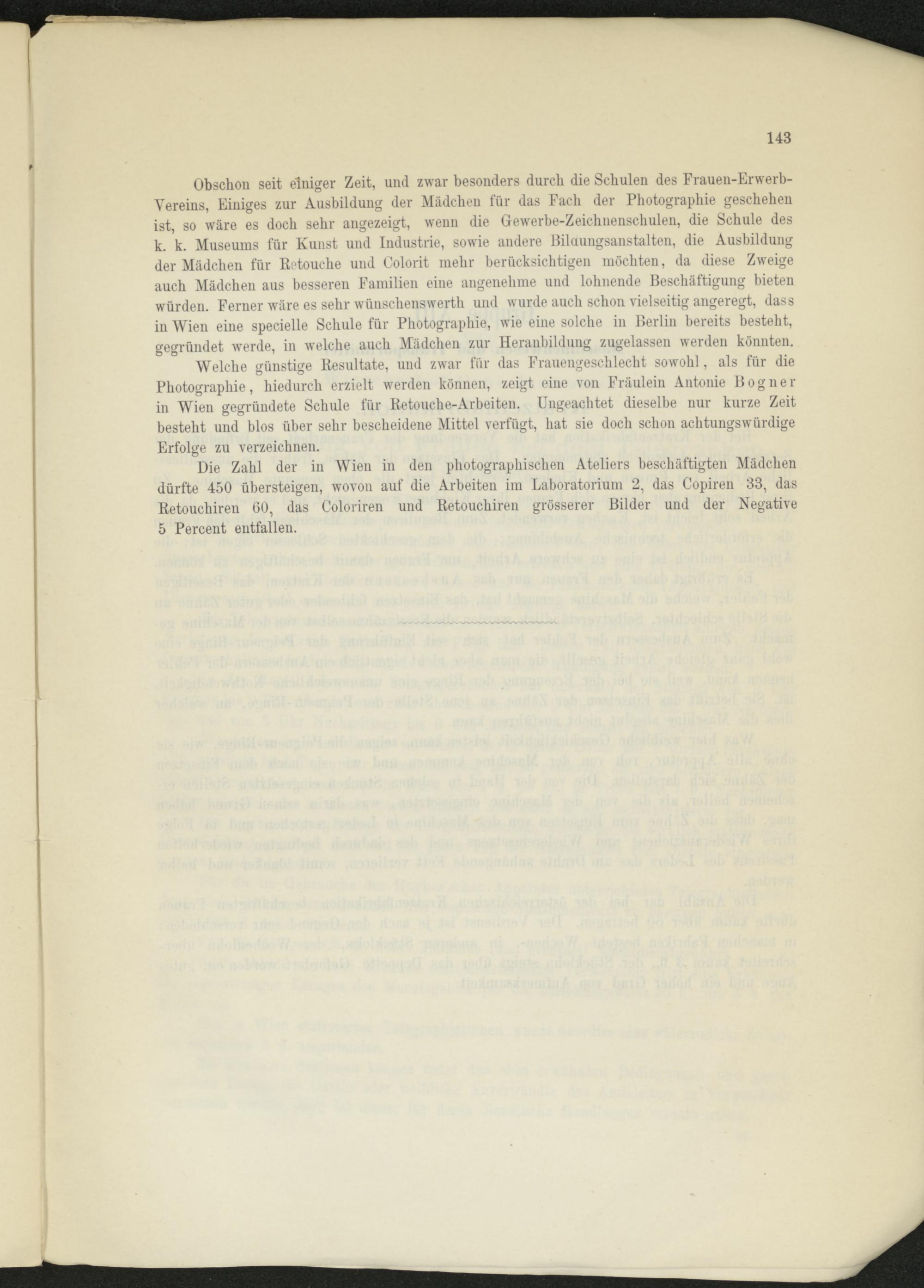 Die Zahl der in Wien in den photographischen Ateliers beschäftigten Mädchen dürfte 450 übersteigen, wovon auf die Arbeiten im Laboratorium 2, das Copiren 33, das Retouchiren 60, das Coloriren und Retouchiren grösserer Bilder und der Negative 5 Percent entfallen.