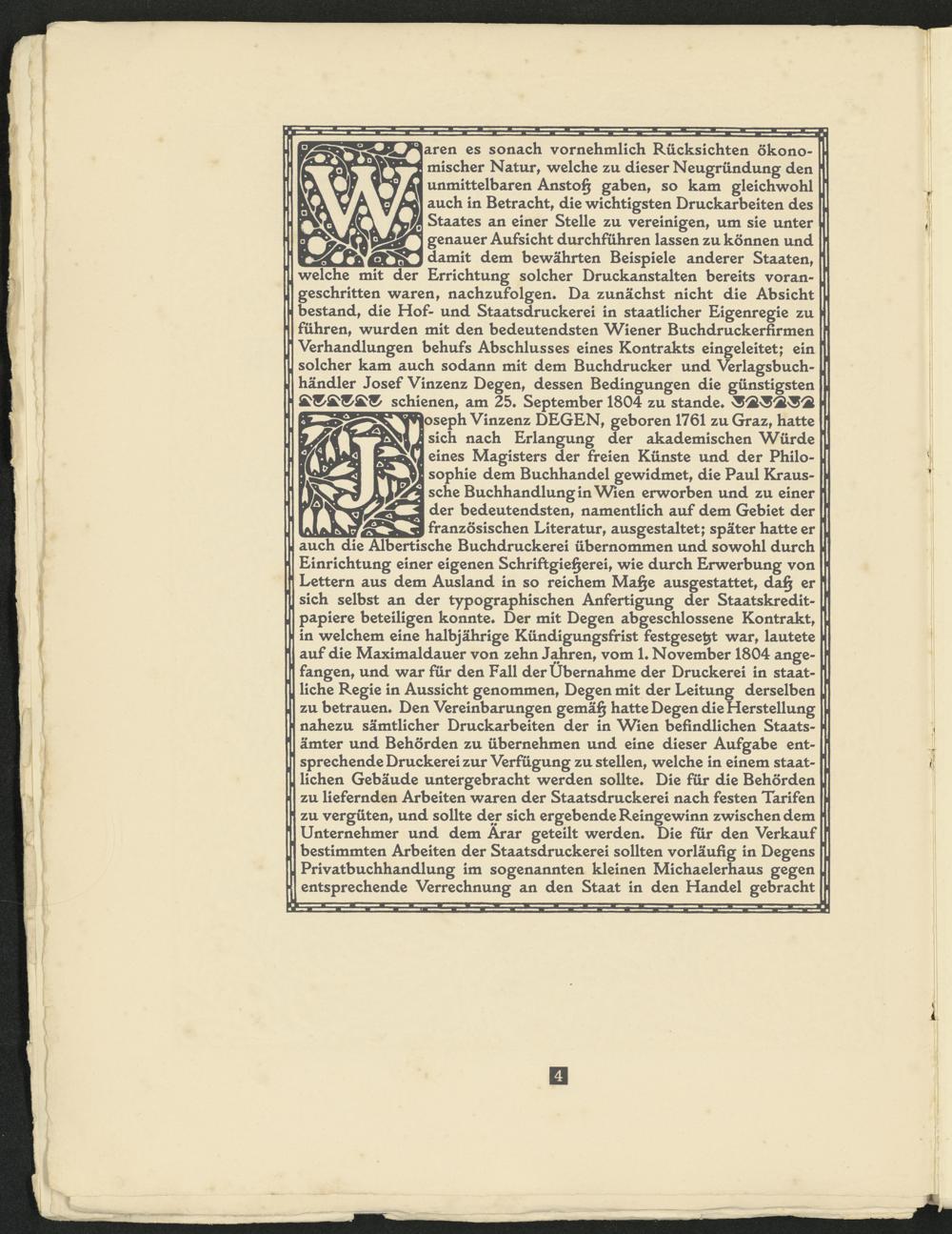 aren es sonach vornehmlich Rücksichten ökonomischer Natur, welche zu dieser Neugründung den unmittelbaren Anstoß gaben, so kam gleichwohl auch in Betracht, die wichtigsten Druckarbeiten des Staates an einer Stelle zu vereinigen, um sie unter genauer Aufsicht durchführen lassen zu können und damit dem bewährten Beispiele anderer Staaten, welche mit der Errichtung solcher Druckanstalten bereits vorangeschritten waren, nachzufolgen« Da zunächst nicht die Absicht bestand, die Hof- und Staatsdruckerei in staatlicher Eigenregie zu führen, wurden mit den bedeutendsten Wiener Buchdruckerfirmen Verhandlungen behufs Abschlusses eines Kontrakts eingeleitet; ein solcher kam auch sodann mit dem Buchdrucker und Verlagsbuchhändler Josef Vinzenz Degen, dessen Bedingungen die günstigsten schienen, am 25« September 1804 zu stände«