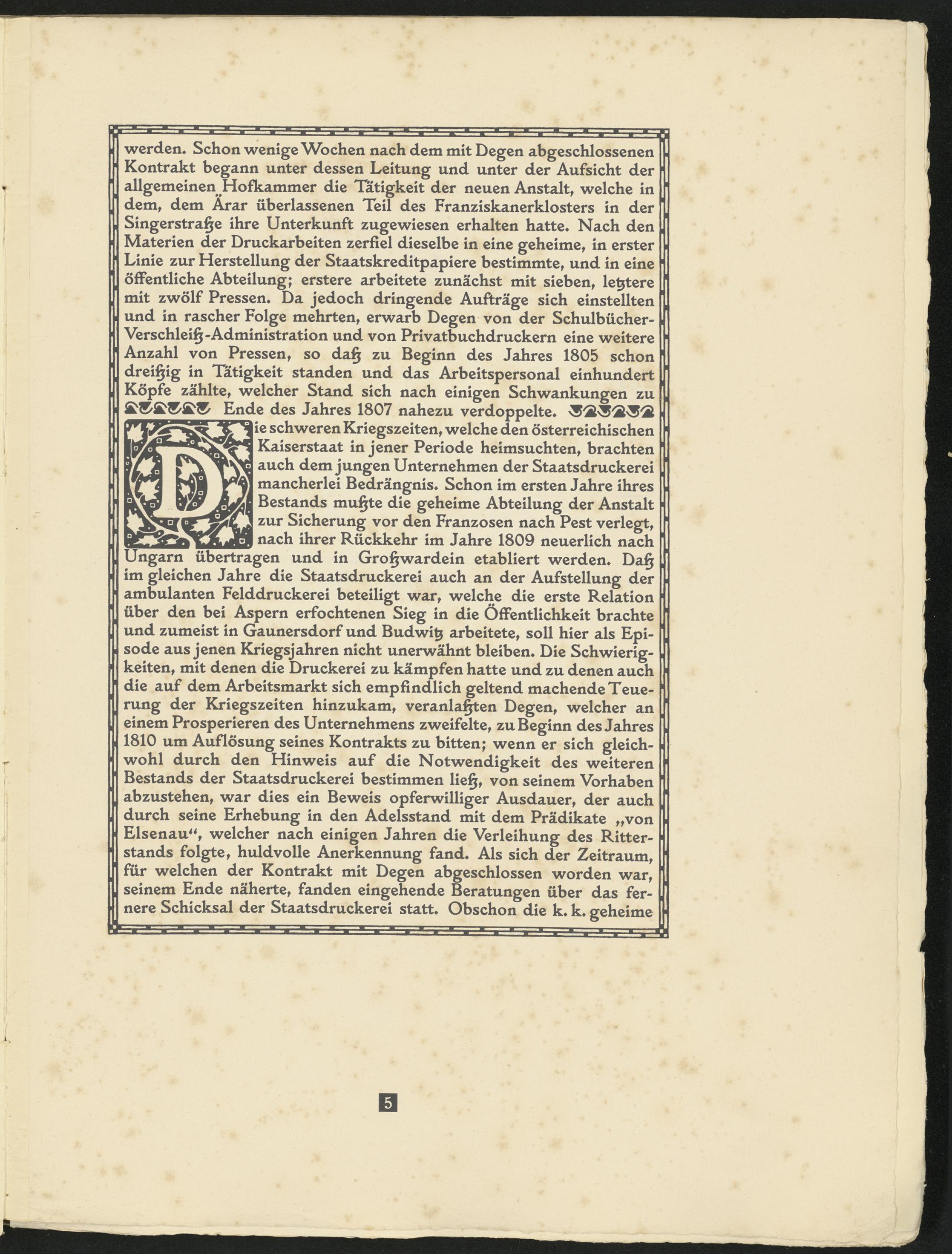 *SlrtrTj|ie schweren Kriegszeiten, welche den österreichischen Kaiserstaat in jener Periode heimsuchten, brachten auch dem jungen Unternehmen der Staatsdruckerei mancherlei Bedrängnis» Schon im ersten Jahre ihres Bestands mu^te die geheime Abteilung der Anstalt zur Sicherung vor den Franzosen nach Pest verlegt, nach ihrer Rückkehr im Jahre 1809 neuerlich nach Ungarn übertragen und in Gro§wardein etabliert werden* Da§ im gleichen Jahre die Staatsdruckerei auch an der Aufstellung der ambulanten Felddruckerei beteiligt war, welche die erste Relation über den bei Aspern erfochtenen Sieg in die Öffentlichkeit brachte und zumeist in Gaunersdorf und Budwit; arbeitete, soll hier als Episode aus jenen Kriegsjahren nicht unerwähnt bleiben« Die Schwierigkeiten, mit denen die Druckerei zu kämpfen hatte und zu denen auch die auf dem Arbeitsmarkt sich empfindlich geltend machende Teuerung der Kriegszeiten hinzukam, veranlagten Degen, welcher an einem Prosperieren des Unternehmens zweifelte, zu Beginn des Jahres 1810 um Auflösung seines Kontrakts zu bitten; wenn er sich gleichwohl durch den Hinweis auf die Notwendigkeit des weiteren Bestands der Staatsdruckerei bestimmen lie§, von seinem Vorhaben abzustehen, war dies ein Beweis opferwilliger Ausdauer, der auch durch seine Erhebung in den Adelsstand mit dem Prädikate „von Elsenau“, welcher nach einigen Jahren die Verleihung des Ritterstands folgte, huldvolle Anerkennung fand« Als sich der Zeitraum, für welchen der Kontrakt mit Degen abgeschlossen worden war, seinem Ende näherte, fanden eingehende Beratungen über das fernere Schicksal der Staatsdruckerei statt« Obschon die k* k» geheime