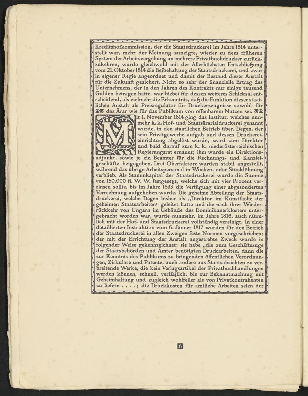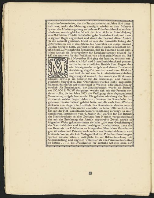 Kreditshofkommission, der die Staatsdruckerei im Jahre 1814 unterstellt war, mehr der Meinung zuneigte, wieder zu dem früheren System der Arbeitsvergebung an mehrere Privatbuchdrucker zurückzukehren, wurde gleichwohl mit der Allerhöchsten Entschließung vom 21* Oktober 1814 die Beibehaltung der Staatsdruckerei, und zwar in eigener Regie angeordnet und damit der Bestand dieser Anstalt für die Zukunft gesichert* Nicht so sehr der finanzielle Ertrag des Unternehmens, der in den Jahren des Kontrakts nur einige tausend Gulden betragen hatte, war hiebei für dessen weiteres Schicksal entscheidend, als vielmehr die Erkenntnis, daß die Funktion dieser staatlichen Anstalt als Preisregulator für Druckerzeugnisse sowohl für das Ärar wie für das Publikum von offenbarem Nutzen sei* ^54 it 1. November 1814 ging das Institut, welches nunmehr k* k* Hof- und Staatsärarialdruckerei genannt wurde, in den staatlichen Betrieb über* Degen, der sein Privatgewerbe aufgab und dessen Druckereieinrichtung abgelöst wurde, ward zum Direktor 3 und bald darauf zum k* k* niederösterreichischen Regierungsrat ernannt; ihm wurde ein Direktionsadjunkt, sowie je ein Beamter für die Rechnungs- und Kanzleigeschäfte beigegeben* Drei Oberfaktore wurden stabil angestellt, während das übrige Arbeitspersonal in Wochen- oder Stücklöhnung verblieb* Als Stammkapital der Staatsdruckerei wurde die Summe von 150*000 fl* W* W* festgesetzt, welche sich mit vier Prozent verzinsen sollte, bis im Jahre 1833 die Verfügung einer abgesonderten Verrechnung aufgehoben wurde. Die geheime Abteilung der Staatsdruckerei, welche Degen bisher als „Direktor im Kunstfache der geheimen Staatsarbeiten“ geleitet hatte und die nach ihrer Wiederrückkehr von Ungarn im Gebäude des Dominikanerklosters untergebracht worden war, wurde nunmehr, im Jahre 1816, auch räumlich mit der Hof- und Staatsdruckerei vollständig vereinigt. In einer detaillierten Instruktion vom 6. Jänner 1817 wurden für den Betrieb der Staatsdruckerei in allen Zweigen feste Normen vorgeschrieben; der mit der Errichtung der Anstalt angestrebte Zweck wurde in folgender Weise gekennzeichnet: sie habe „die zum Geschäftszuge der Staatsbehörden und Ämter benötigten Druckarbeiten, dann die zur Kenntnis des Publikums zu bringenden öffentlichen Verordnungen, Zirkulare und Patente, auch andere aus Staatsabsichten zu verbreitende Werke, die kein Verlagsartikel der Privatbuchhandlungen werden können, schnell, verläßlich, bis zur Bekanntmachung mit Geheimhaltung und zugleich wohlfeiler als von Privatkontrahenten zu liefern . . . . : die Druckkosten für amtliche Arbeiten seien der