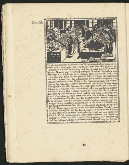 Vergleich mit solchen aus privaten Offizinen standhalten konnten* In einem neuen Amtsunterricht wurde im Jahre 1834 den geänderten Verhältnissen in der Verwaltung und dem Betrieb der Anstalt durch genaue Normierung Rechnung getragen* In seinem Bestreben, das Arbeitsgebiet möglichst zu erweitern, fand Wohlfarth wirksame Unterstützung durch die im gleichen Jahre verfügte Einverleibung der seit längerem bei der allgemeinen Hofkammer eingerichteten Steindruckanstalt in den Verband der Staatsdruckerei; zur Verringerung der Schreibgeschäfte der Behörden bestimmt, arbeitete diese Lithographie auf acht Pressen, für welche jedoch erst im Jahre 1840 Räume im Gebäude der Staatsdruckerei selbst zur Verfügung gestellt werden konnten* Des weiteren wurde im Jahre 1836 die technische Einrichtung der Staatsdruckerei, welche seit ihrer Gründung nur durch Übernahme des teils veralteten, teils unbrauchbaren Inventars der aufgelassenen Druckereien der Taubstummen-Anstalt und der k. k*Tilgungs- und Einlösungsdeputation ergänzt worden war, der Ausgestaltung zugeführt* Zu erwähnen ist vor allem die Einführung des dampfmotorischen Betriebs, welche durch die Anschaffung einer dreipferdigen Dampfmaschine von den Mechanikern Fletcher und Punchon ermöglicht wurde; dieselbe hatte, in einem neuen Zubaue zu den Betriebslokalitäten untergebracht, zwei um den Preis von 8500 fl* C* M* neuangekaufte Schnelldruckpressen mit Kraft zu versorgen* Hand in Hand mit der Verbesserung der Einrichtung und der in ihrem Gefolge sich einstellenden Vermehrung der Arbeits-