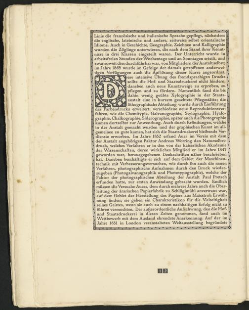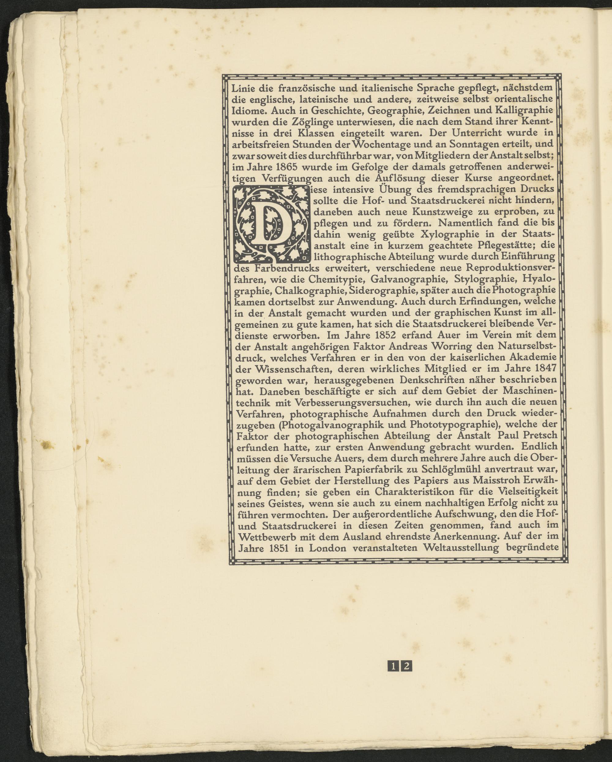 iiese intensive Übung des fremdsprachigen Drucks sollte die Hof- und Staatsdruckerei nicht hindern, daneben auch neue Kunstzweige zu erproben, zu pflegen und zu fördern» Namentlich fand die bis dahin wenig geübte Xylographie in der Staatsanstalt eine in kurzem geachtete Pflegestätte; die lithographische Abteilung wurde durch Einführung des Farbendrucks erweitert, verschiedene neue Reproduktionsverfahren, wie die Chemitypie, Galvanographie, Stylographie, Hyalo- graphie, Chalkographie, Siderographie, später auch die Photographie kamen dortselbst zur Anwendung» Auch durch Erfindungen, welche in der Anstalt gemacht wurden und der graphischen Kunst im allgemeinen zu gute kamen, hat sich die Staatsdruckerei bleibende Verdienste erworben» Im Jahre 1852 erfand Auer im Verein mit dem der Anstalt angehörigen Faktor Andreas Worring den Naturselbstdruck, welches Verfahren er in den von der kaiserlichen Akademie der Wissenschaften, deren wirkliches Mitglied er im Jahre 1847 geworden war, herausgegebenen Denkschriften näher beschrieben hat* Daneben beschäftigte er sich auf dem Gebiet der Maschinentechnik mit Verbesserungsversuchen, wie durch ihn auch die neuen Verfahren, photographische Aufnahmen durch den Druck wiederzugeben (Photogalvanographik und Phototypographie), welche der Faktor der photographischen Abteilung der Anstalt Paul Pretsch erfunden hatte, zur ersten Anwendung gebracht wurden. Endlich müssen die Versuche Auers, dem durch mehrere Jahre auch die Oberleitung der ärarischen Papierfabrik zu Schlöglmühl anvertraut war auf dem Gebiet der Herstellung des Papiers aus Maisstroh Erwähnung finden; sie geben ein Charakteristikon für die Vielseitigkeit seines Geistes, wenn sie auch zu einem nachhaltigen Erfolg nicht zu führen vermochten* Der außerordentliche Aufschwung, den die Hof- und Staatsdruckerei in diesen Zeiten genommen, fand auch im Wettbewerb mit dem Ausland ehrendste Anerkennung. Auf der im Jahre 1851 in London veranstalteten Weltausstellung begründete