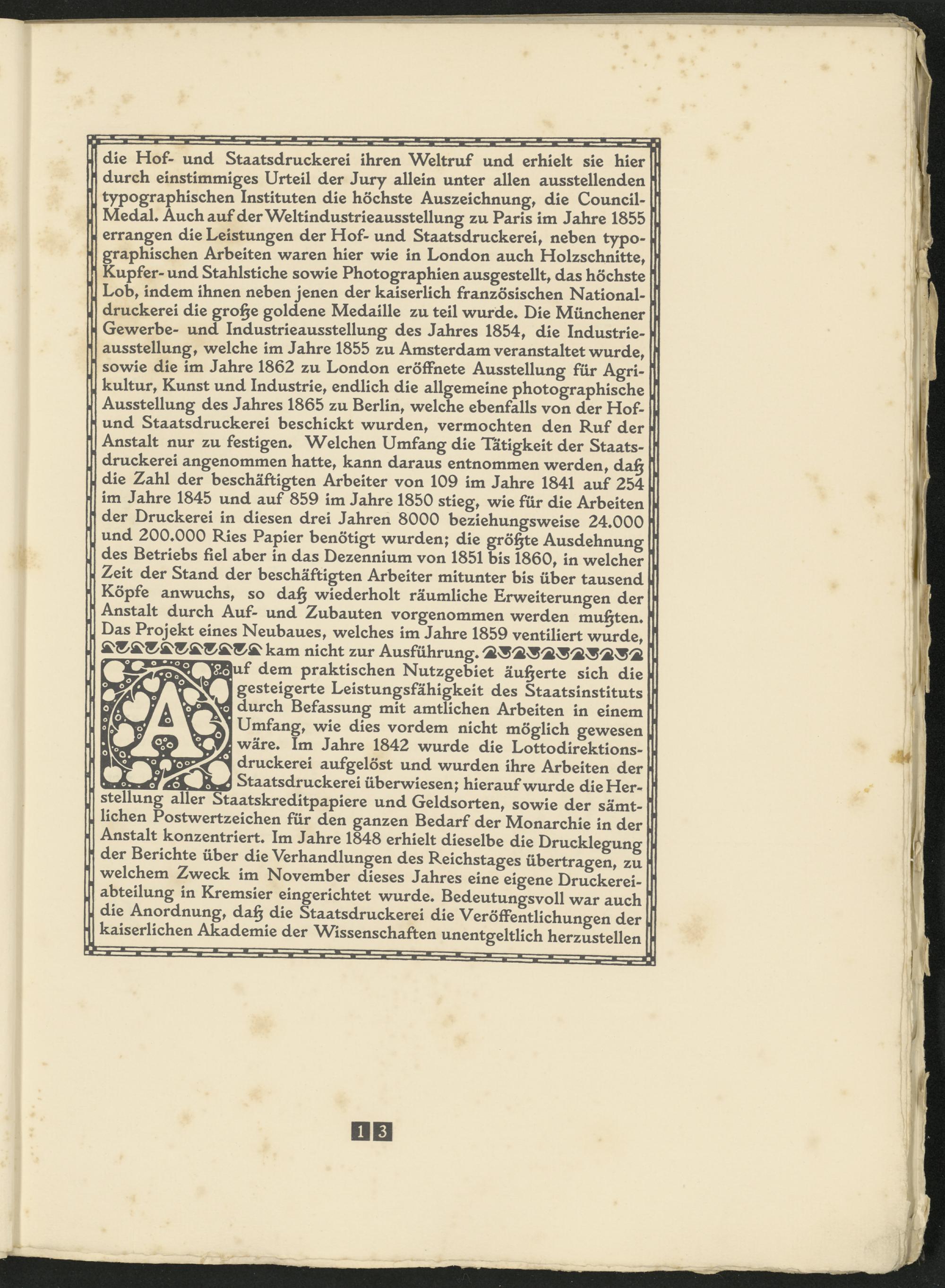 die Hof- und Staatsdruckerei ihren Weltruf und erhielt sie hier durch einstimmiges Urteil der Jury allein unter allen ausstellenden typographischen Instituten die höchste Auszeichnung, die Council- Medal* Auch auf der Weltindustrieausstellung zu Paris im Jahre 1855 errangen die Leistungen der Hof- und Staatsdruckerei, neben typographischen Arbeiten waren hier wie in London auch Holzschnitte, Kupfer- und Stahlstiche sowie Photographien ausgestellt, das höchste Lob, indem ihnen neben jenen der kaiserlich französischen Nationaldruckerei die gro§e goldene Medaille zu teil wurde* Die Münchener Gewerbe- und Industrieausstellung des Jahres 1854, die Industrieausstellung, welche im Jahre 1855 zu Amsterdam veranstaltet wurde, sowie die im Jahre 1862 zu London er öffnete Ausstellung für Agrikultur, Kunst und Industrie, endlich die allgemeine photographische Ausstellung des Jahres 1865 zu Berlin, welche ebenfalls von der Hof- und Staatsdruckerei beschickt wurden, vermochten den Ruf der Anstalt nur zu festigen* Welchen Umfang die Tätigkeit der Staatsdruckerei angenommen hatte, kann daraus entnommen werden, da§ die Zahl der beschäftigten Arbeiter von 109 im Jahre 1841 auf 254 im Jahre 1845 und auf 859 im Jahre 1850 stieg, wie für die Arbeiten der Druckerei in diesen drei Jahren 8000 beziehungsweise 24*000 und 200*000 Ries Papier benötigt wurden; die größte Ausdehnung des Betriebs fiel aber in das Dezennium von 1851 bis 1860, in welcher Zeit der Stand der beschäftigten Arbeiter mitunter bis über tausend Köpfe anwuchs, so da§ wiederholt räumliche Erweiterungen der Anstalt durch Auf- und Zubauten vorgenommen werden mußten* Das Projekt eines Neubaues, welches im Jahre 1859 ventiliert wurde, 1t® kam nicht zur Ausführung* / 2^ / 2L^ / 3L35'SLZ5 / iL^5 / 3L