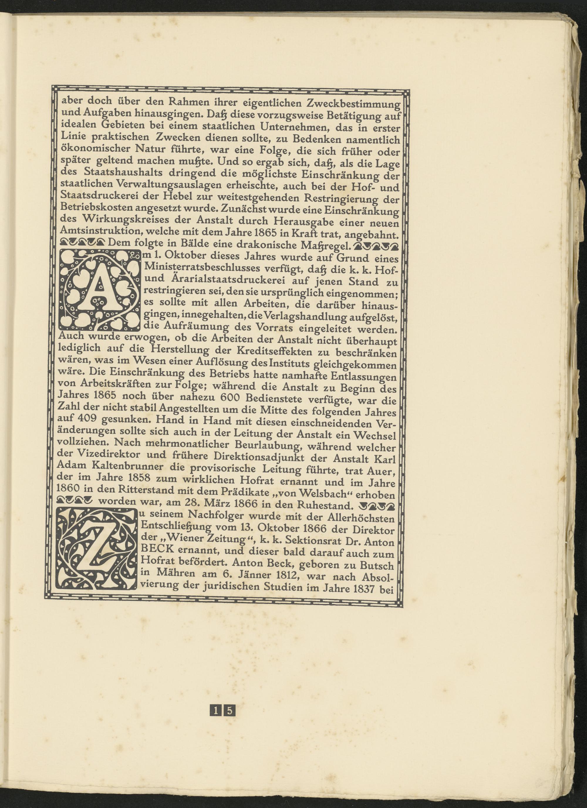 m 1» Oktober dieses Jahres wurde auf Grund eines Ministerratsbeschlusses verfügt, da§ die k» k» Hof- und Ararialstaatsdruckerei auf jenen Stand zu restringieren sei, den sie ursprünglich eingenommen; es sollte mit allen Arbeiten, die darüber hinausgingen, innegehalten, die Verlagshandlung aufgelöst,