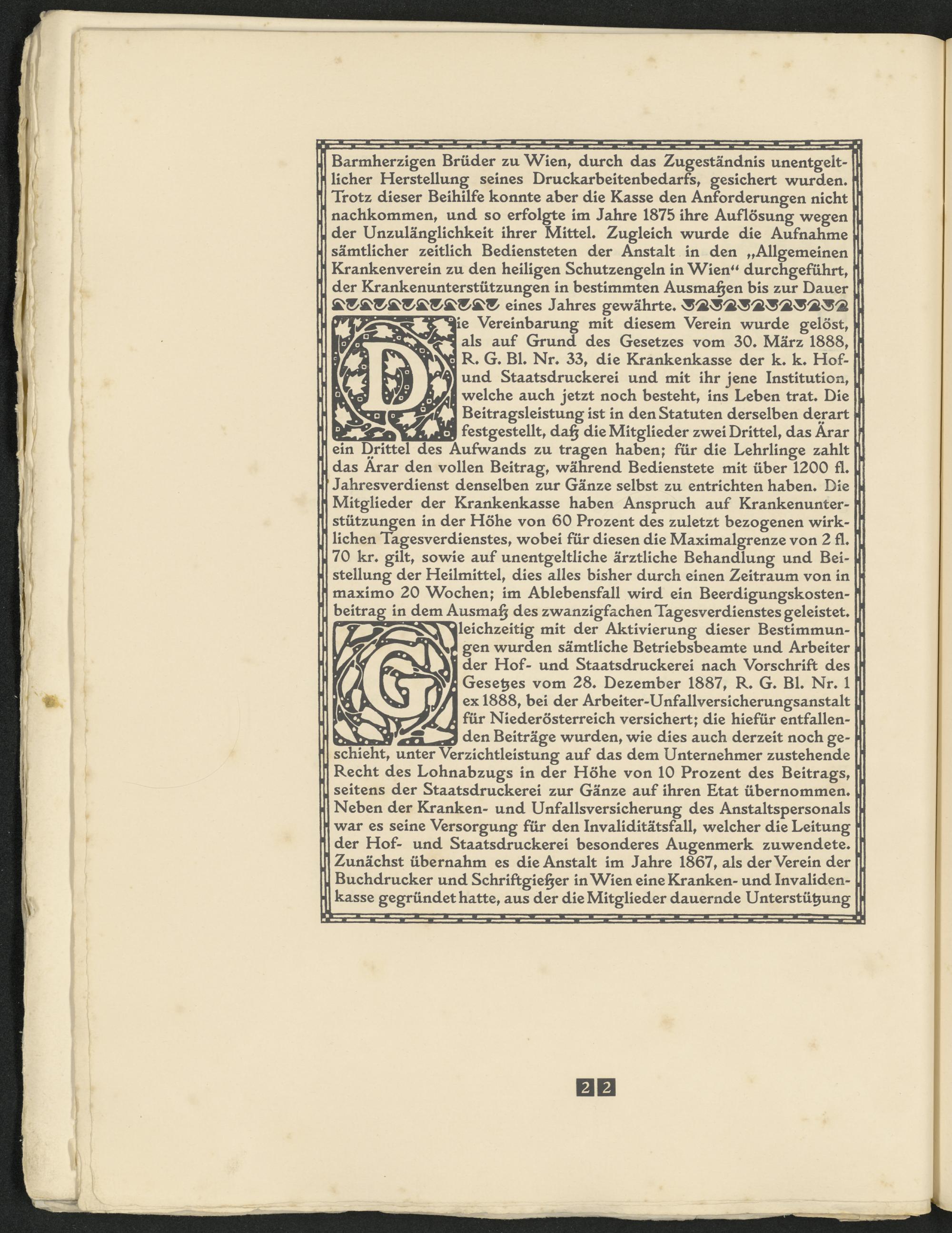 ^3 den Beiträge wurden, wie dies auch derzeit noch geschieht, unter Verzichtleistung auf das dem Unternehmer zustehende Recht des Lohnabzugs in der Höhe von 10 Prozent des Beitrags, seitens der Staatsdruckerei zur Gänze auf ihren Etat übernommen* Neben der Kranken- und Unfallsversicherung des Anstaltspersonals war es seine Versorgung für den Invaliditätsfall, welcher die Leitung der Hof- und Staatsdruckerei besonderes Augenmerk zuwendete Zunächst übernahm es die Anstalt im Jahre 1867, als der Verein der Buchdrucker und Schriftgie§er in Wien eine Kranken- und Invalidenkasse gegründet hatte, aus der die Mitglieder dauernde Unterstützung