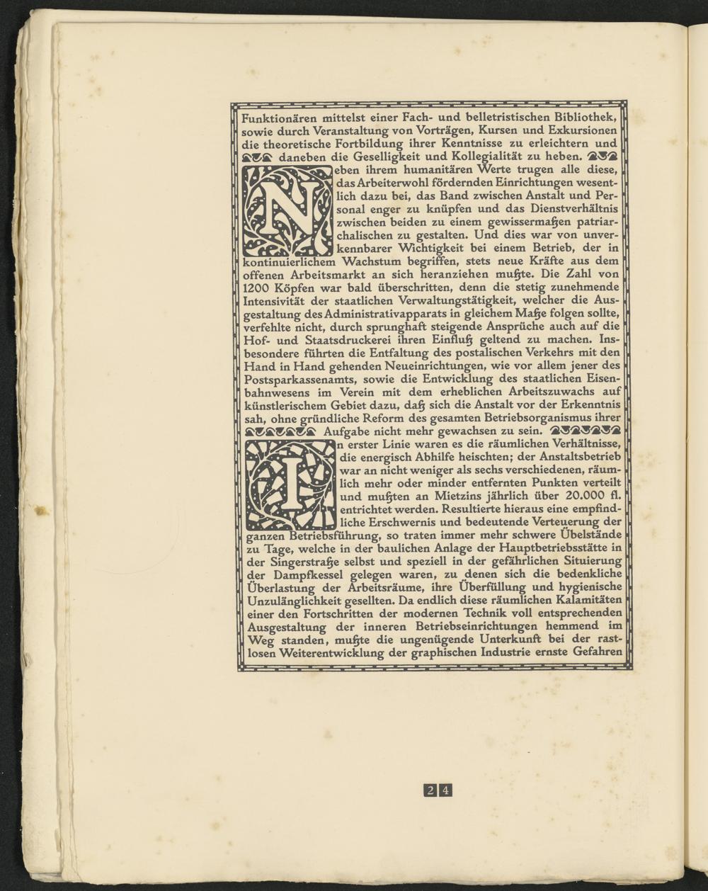eben ihrem humanitären Werte trugen alle diese, das Arbeiterwohl fördernden Einrichtungen wesentlich dazu bei, das Band zwischen Anstalt und Personal enger zu knüpfen und das Dienstverhältnis zwischen beiden zu einem gewissermaßen patriarchalischen zu gestalten« Und dies war von unverkennbarer Wichtigkeit bei einem Betrieb, der in kontinuierlichem Wachstum begriffen, stets neue Kräfte aus dem offenen Arbeitsmarkt an sich heranziehen mußte« Die Zahl von 1200 Köpfen war bald überschritten, denn die stetig zunehmende Intensivität der staatlichen Verwaltungstätigkeit, welcher die Ausgestaltung des Administrativapparats in gleichem Maße folgen sollte, verfehlte nicht, durch sprunghaft steigende Ansprüche auch auf die Hof- und Staatsdruckerei ihren Einfluß geltend zu machen« Insbesondere führten die Entfaltung des postalischen Verkehrs mit den Hand in Hand gehenden Neueinrichtungen, wie vor allem jener des Postsparkassenamts, sowie die Entwicklung des staatlichen Eisenbahnwesens im Verein mit dem erheblichen Arbeitszuwachs auf künstlerischem Gebiet dazu, daß sich die Anstalt vor der Erkenntnis sah, ohne gründliche Reform des gesamten Betriebsorganismus ihrer Aufgabe nicht mehr gewachsen zu sein«