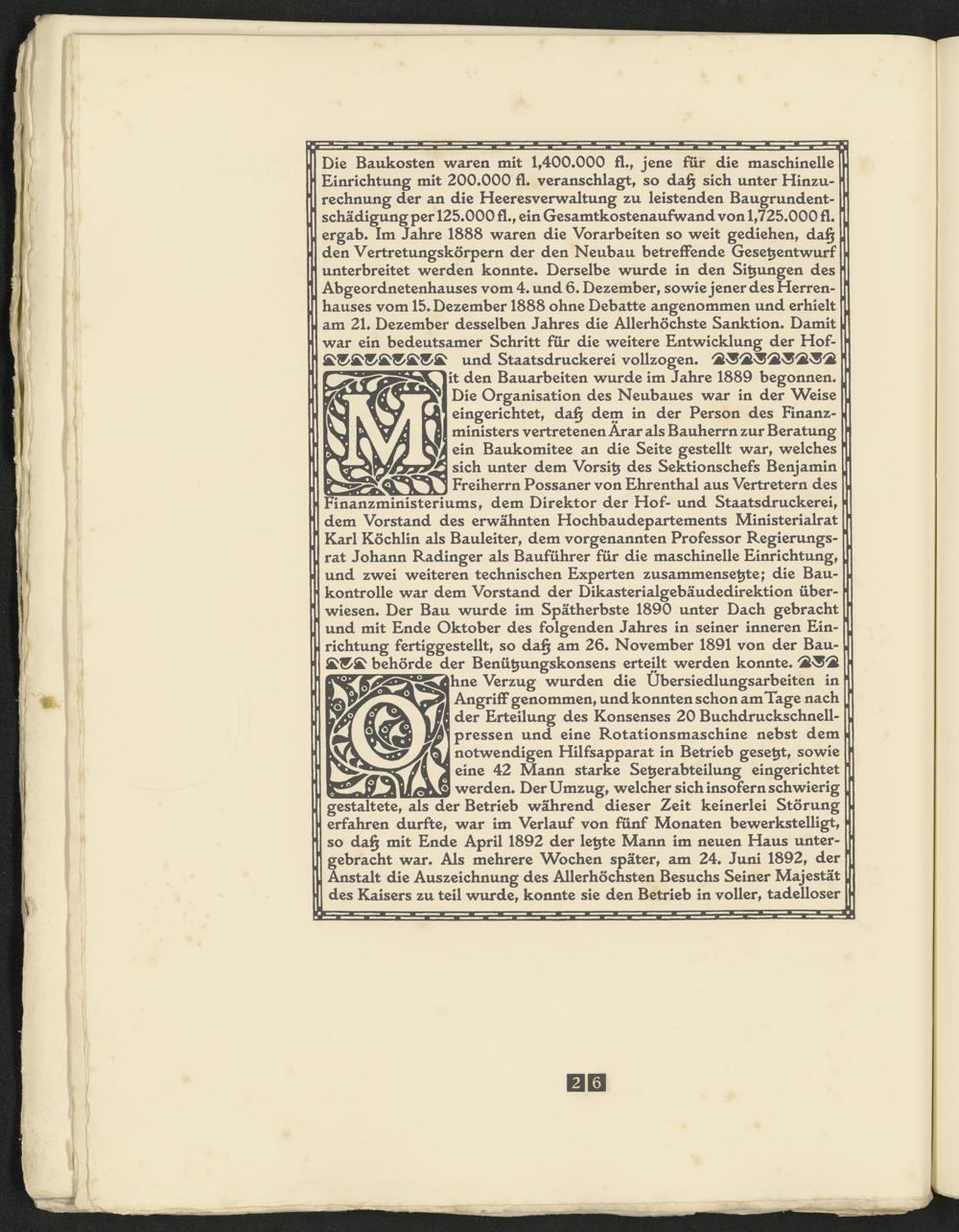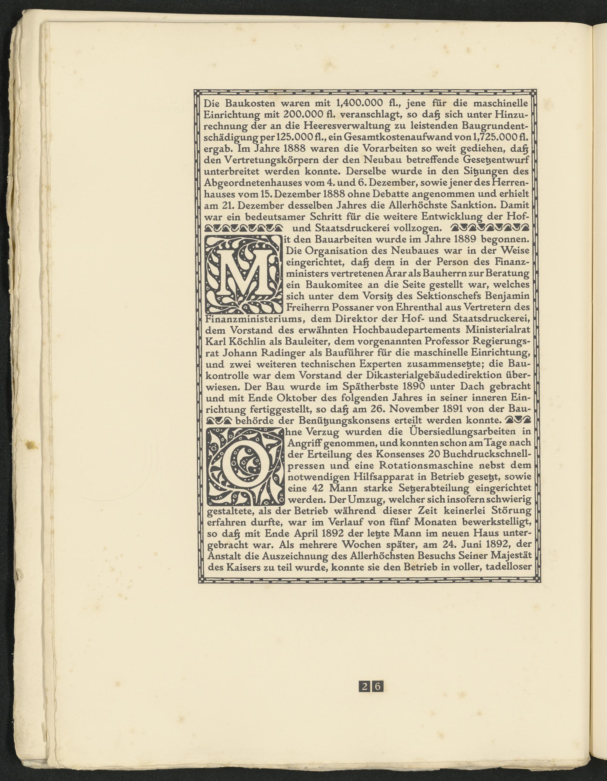 und Staatsdruckerei vollzogen* it den Bauarbeiten wurde im Jahre 1889 begonnen* Die Organisation des Neubaues war in der Weise eingerichtet, da§ dem in der Person des Finanzministers vertretenen Ärar als Bauherrn zur Beratung ein Baukomitee an die Seite gestellt war, welches sich unter dem Vorsitj des Sektionschefs Benjamin Freiherrn Possaner von Ehrenthal aus Vertretern des Finanzministeriums, dem Direktor der Hof- und Staatsdruckerei, dem Vorstand des erwähnten Hochbaudepartements Ministerialrat Karl Köchlin als Bauleiter, dem vorgenannten Professor Regierungsrat Johann Radinger als Bauführer für die maschinelle Einrichtung, und zwei weiteren technischen Experten zusammenset^te; die Baukontrolle war dem Vorstand der Dikasterialgebäudedirektion überwiesen* Der Bau wurde im Spätherbste 1890 unter Dach gebracht und mit Ende Oktober des folgenden Jahres in seiner inneren Einrichtung fertiggestellt, so da§ am 26* November 1891 von der Bau- behörde der Benüt^ungskonsens erteilt werden konnte*