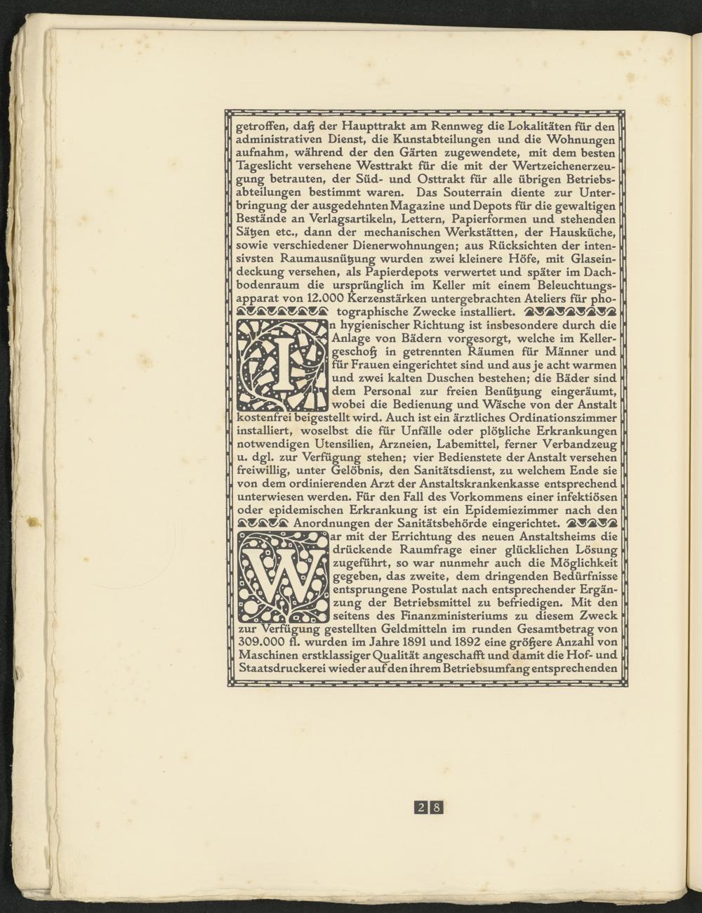 getroffen, daß der Haupttrakt am Rennweg die Lokalitäten für den administrativen Dienst, die Kunstabteilungen und die Wohnungen aufnahm, während der den Gärten zugewendete, mit dem besten Tageslicht versehene Westtrakt für die mit der Wertzeichenerzeugung betrauten, der Süd- und Osttrakt für alle übrigen Betriebsabteilungen bestimmt waren* Das Souterrain diente zur Unterbringung der ausgedehnten Magazine und Depots für die gewaltigen Bestände an Verlagsartikeln, Lettern, Papierformen und stehenden Sätzen etc*, dann der mechanischen Werkstätten, der Hausküche, sowie verschiedener Dienerwohnungen; aus Rücksichten der intensivsten Raumausnützung wurden zwei kleinere Höfe, mit Glaseindeckung versehen, als Papierdepots verwertet und später im Dachbodenraum die ursprünglich im Keller mit einem Beleuchtungsapparat von 12*000 Kerzenstärken untergebrachten Ateliers für pho-