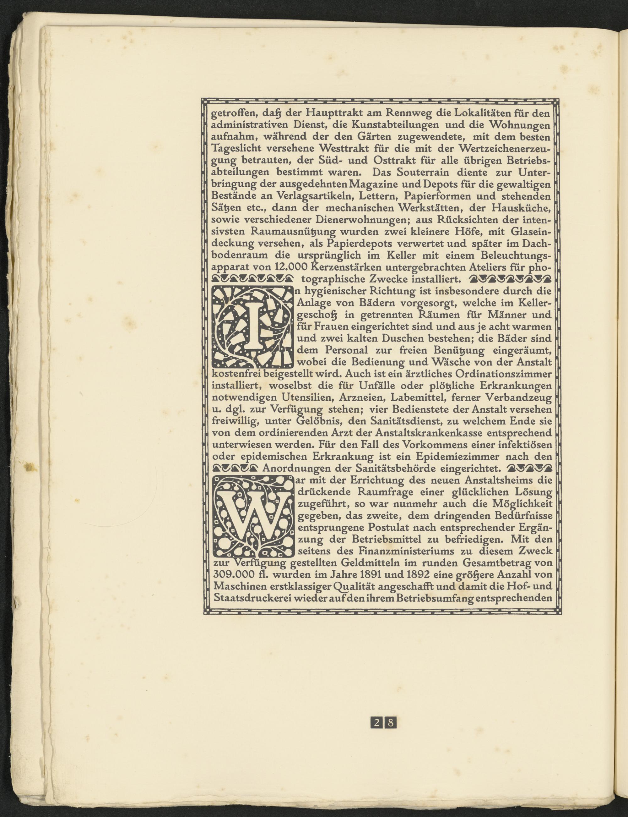 tographische Zwecke installiert* hygienischer Richtung ist insbesondere durch die Anlage von Bädern vorgesorgt, welche im Kellergeschoß in getrennten Räumen für Männer und für Frauen eingerichtet sind und aus je acht warmen und zwei kalten Duschen bestehen; die Bäder sind dem Personal zur freien Benützung eingeräumt, wobei die Bedienung und Wäsche von der Anstalt kostenfrei beigestellt wird* Auch ist ein ärztliches Ordinationszimmer installiert, woselbst die für Unfälle oder plötzliche Erkrankungen notwendigen Utensilien, Arzneien, Labemittel, ferner Verbandzeug u* dgl* zur Verfügung stehen; vier Bedienstete der Anstalt versehen freiwillig, unter Gelöbnis, den Sanitätsdienst, zu welchem Ende sie von dem ordinierenden Arzt der Anstaltskrankenkasse entsprechend unterwiesen werden. Für den Fall des Vorkommens einer infektiösen oder epidemischen Erkrankung ist ein Epidemiezimmer nach den Anordnungen der Sanitätsbehörde eingerichtet* / 2>& / 2>!S / 3L ^ar mit der Errichtung des neuen Anstaltsheims die drückende Raumfrage einer glücklichen Lösung zugeführt, so war nunmehr auch die Möglichkeit gegeben, das zweite, dem dringenden Bedürfnisse Sjj entsprungene Postulat nach entsprechender Ergänzung der Betriebsmittel zu befriedigen. Mit den seitens des Finanzministeriums zu diesem Zweck zur Verfügung gestellten Geldmitteln im runden Gesamtbetrag von 309*000 fl. wurden im Jahre 1891 und 1892 eine größere Anzahl von Maschinen erstklassiger Qualität angeschafft und damit die Hof- und Staatsdruckerei wieder auf den ihrem Betriebsumfang entsprechenden