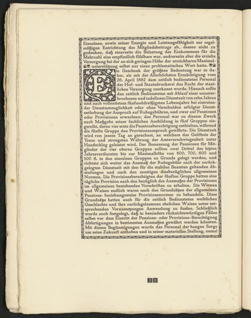 in Geschenk der größten Bedeutung war es daher, als mit der Allerhöchsten Ermächtigung vom 26* April 1892 dem zeitlich bediensteten Personal der Hof- und Staatsdruckerei das Recht der staatlichen Versorgung zuerkannt wurde« Hienach sollte den zeitlich Bediensteten mit Ablauf einer ununterbrochenen und tadellosen Dienstzeit von zehn Jahren und nach vollendetem fünfunddreißigsten Lebensjahre bei eintretender Dienstuntauglichkeit oder ohne Verschulden erfolgter Dienstenthebung der Anspruch auf Ruhegebühren, und zwar auf Pensionen oder Provisionen erwachsen; das Personal war zu diesem Zweck nach Maßgabe seiner fachlichen Ausbildung in fünf Gruppen eingereiht, deren vier erste die Pensionsberechtigung enthielten, während die fünfte Gruppe den Provisionsanspruch gewährte« Die Dienstzeit wird von jenem Tag an gerechnet, an welchem das Gelöbnis der Treue und strengsten Wahrung der Amtsverschwiegenheit unter Handschlag geleistet wird« Der Bemessung der Pensionen für Mitglieder der vier oberen Gruppen sollten zwei Drittel des lebten Jahresverdienstes bis zur Maximalhöhe von 800, 700, 600 und 500 fl« in den einzelnen Gruppen zu Grunde gelegt werden, und richtete sich weiter das Ausmaß der Ruhegebühr nach der zurückgelegten Dienstzeit mit den für die stabilen Beamten geltenden Abstufungen und nach den sonstigen diesbezüglichen allgemeinen Normen« Die Provisionsberechtigten der fünften Gruppe hatten eine tägliche Provision nach den bezüglich des Ausmaßes der Provisionen im allgemeinen bestehenden Vorschriften zu erhalten« Die Witwen und Waisen endlich waren nach den Grundsätzen der allgemeinen Pensions- beziehungsweise Provisionsnormen zu behandeln« Diese Grundsätze hatten auch für die zeitlich Bediensteten weiblichen Geschlechts und ihre zurückgelassenen ehelichen Waisen unter entsprechenden Voraussetzungen Anwendung zu finden« Schließlich wurde auch festgelegt, daß in besonders rücksichtswürdigen Fällen selbst vor dem Eintritt der Pensions- oder Provisions-Berechtigung Abfertigungen in bestimmten Ausmaßen gewährt werden könnten« Mit diesen Begünstigungen wurde das Personal der bangen Sorge um seine Zukunft enthoben und in seiner materiellen Stellung, zumal