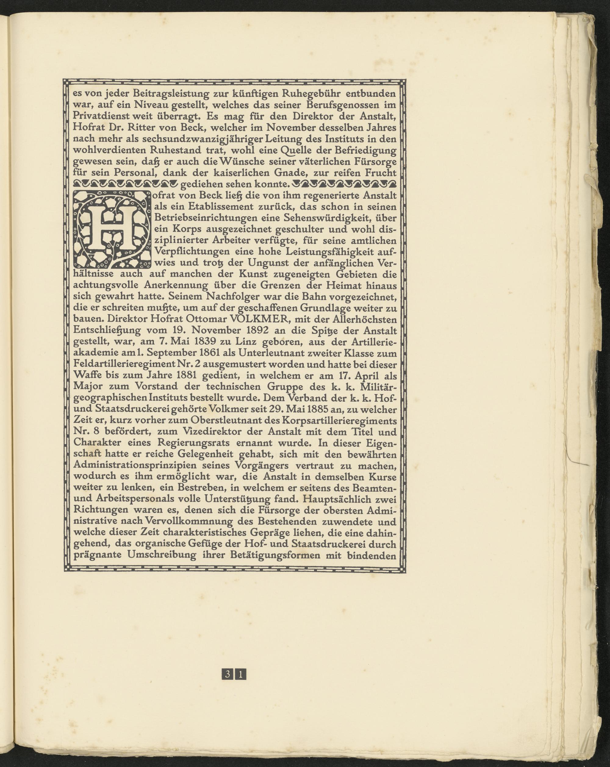 31 ein Korps ausgezeichnet geschulter und wohl dis- g ziplinierter Arbeiter verfügte, für seine amtlichen Verpflichtungen eine hohe Leistungsfähigkeit auf- _^ wies und trotz der Ungunst der anfänglichen Verhältnisse auch auf manchen der Kunst zugeneigten Gebieten die achtungsvolle Anerkennung über die Grenzen der Heimat hinaus sich gewahrt hatte« Seinem Nachfolger war die Bahn vorgezeichnet, die er schreiten mußte, um auf der geschaffenen Grundlage weiter zu bauen» Direktor Hofrat Ottomar VOLKMER, mit der Allerhöchsten Entschließung vom 19» November 1892 an die Spitze der Anstalt gestellt, war, am 7» Mai 1839 zu Linz geboren, aus der Artillerieakademie aml» September 1861 als Unterleutnant zweiter Klasse zum Feldartillerieregiment Nr» 2 ausgemustert worden und hatte bei dieser Waffe bis zum Jahre 1881 gedient, in welchem er am 17« April als Major zum Vorstand der technischen Gruppe des k« k» Militärgeographischen Instituts bestellt wurde» Dem Verband der k» k» Hof- und Staatsdruckerei gehörte Volkmer seit 29» Mai 1885 an, zu welcher Zeit er, kurz vorher zum Oberstleutnant des Korpsartillerieregiments Nr* 8 befördert, zum Vizedirektor der Anstalt mit dem Titel und Charakter eines Regierungsrats ernannt wurde« In dieser Eigenschaft hatte er reiche Gelegenheit gehabt, sich mit den bewährten Administrationsprinzipien seines Vorgängers vertraut zu machen, wodurch es ihm ermöglicht war, die Anstalt in demselben Kurse weiter zu lenken, ein Bestreben, in welchem er seitens des Beamten- und Arbeitspersonals volle Unterstützung fand» Hauptsächlich zwei Richtungen waren es, denen sich die Fürsorge der obersten Administrative nach Vervollkommnung des Bestehenden zuwendete und welche dieser Zeit charakteristisches Gepräge liehen, die eine dahingehend, das organische Gefüge der Hof- und Staatsdruckerei durch prägnante Umschreibung ihrer Betätigungsformen mit bindenden