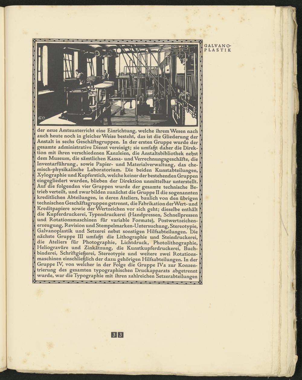 der neue Amtsunterricht eine Einrichtung, welche ihrem Wesen nach auch heute noch in gleicherweise besteht, das ist die Gliederung der Anstalt in sechs Geschäftsgruppen* In der ersten Gruppe wurde der gesamte administrative Dienst vereinigt; sie umfaßt daher die Direktion mit ihren verschiedenen Kanzleien, die Anstaltsbibliothek nebst dem Museum, die sämtlichen Kassa- und Verrechnungsgeschäfte, die Inventarführung, sowie Papier- und Materialverwaltung, das chemisch-physikalische Laboratorium* Die beiden Kunstabteilungen, Xylographie und Kupferstich, welche keiner der bestehenden Gruppen eingegliedert wurden, blieben der Direktion unmittelbar unterstellt* Auf die folgenden vier Gruppen wurde der gesamte technische Betrieb verteilt, und zwar bilden zunächst die Gruppe II die sogenannten kreditlichen Abteilungen, in deren Ateliers, baulich von den übrigen technischen Geschäftsgruppen getrennt, die Fabrikation der Wert- und Kreditpapiere sowie der Wertzeichen vor sich geht; dieselbe enthält die Kupferdruckerei, Typendruckerei (Handpressen, Schnellpressen und Rotationsmaschinen für variable Formate), Postwertzeichenerzeugung, Revision undStempelmarken-Untersuchung, Stereotypie, Galvanoplastik und Setzerei nebst sonstigen Hilfsabteilungen* Die nächste Gruppe III umfaßt die Lithographie und Steindruckerei, die Ateliers für Photographie, Lichtdruck, Photolithographie, Heliogravüre und Zinkätzung, die Kunstkupferdruckerei, Buchbinderei, Schriftgießerei, Stereotypie und weitere zwei Rotationsmaschinen einschließlich der dazu gehörigen Hilfsabteilungen* In der Gruppe IV, von welcher in der Folge die Gruppe IVa zur Konzentrierung des gesamten typographischen Druckapparats abgetrennt wurde, war die Typographie mit ihren zahlreichen Setzerabteilungen